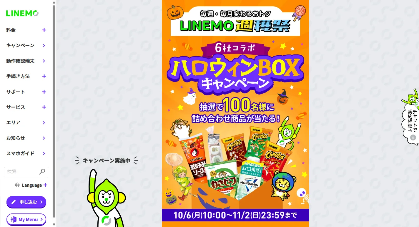LINEMO週穫祭6社コラボ!ハロウィンBOXキャンペーン|LINEMO週穫祭|【公式】LINEMO – ラインモ|格安SIM/格安スマホ https://www.linemo.jp/campaign/syukakusai/202510/ more