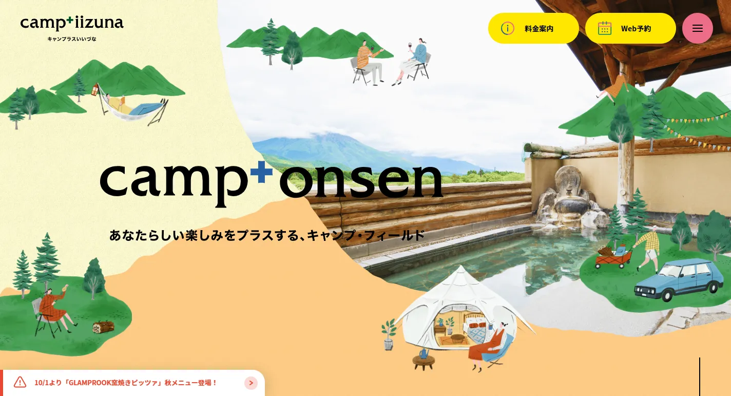 キャンプラスいいづな(飯綱東高原オートキャンプ場) – 長野市内から車で20分。長野県飯綱町の飯綱高原に位置するキャンプ場です。本格ギアをご用意して、手ぶらで楽しめるキャンプやオートキャンプ、BBQや温泉などのアクティビティも充実。 https://camplus.camp/ more