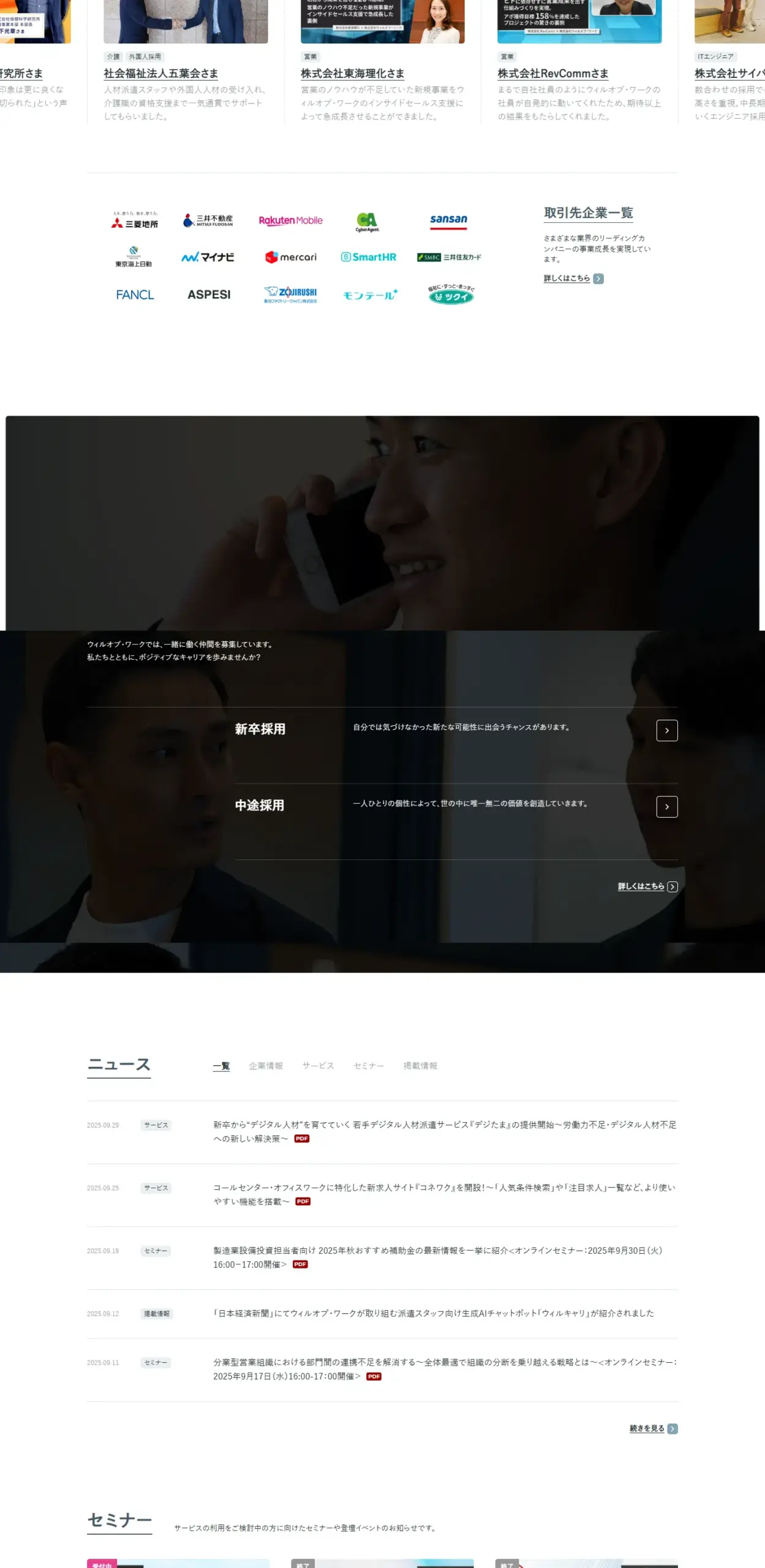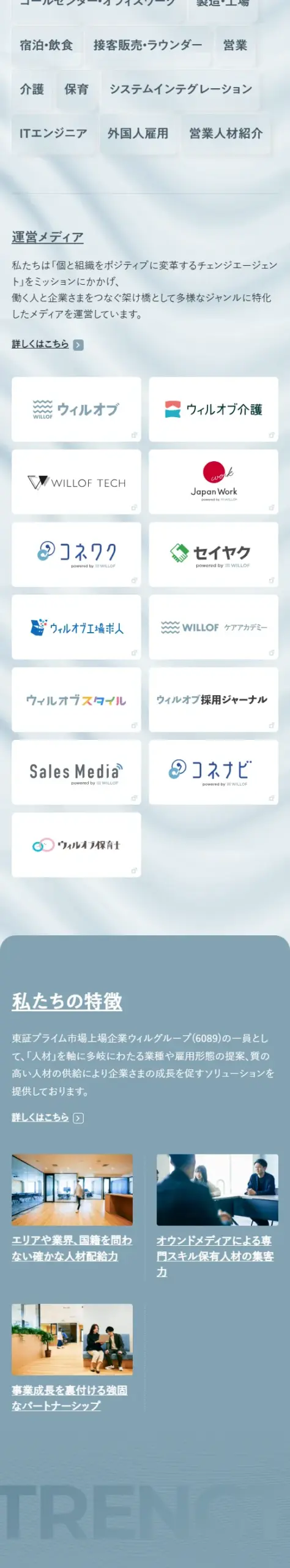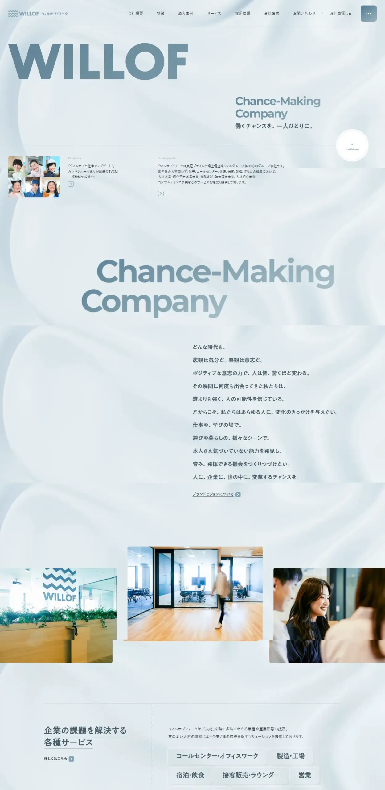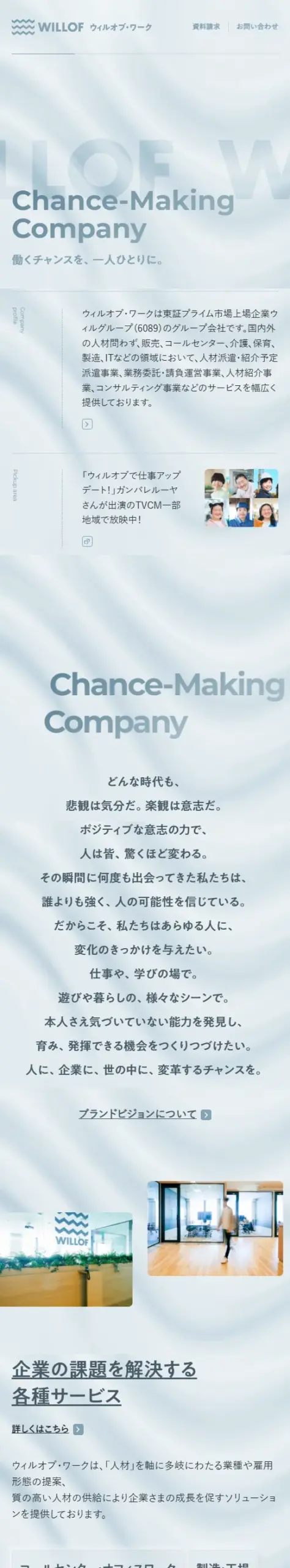 株式会社ウィルオブ・ワークの企業情報、サービスの紹介、ニュース、採用情報などをご紹介している公式企業サイトです。東証プライム市場上場企業(6089)ウィルグループの子会社として、ウィルオブ・ワークは人材派遣・紹介予定派遣事業、業務委託・請負運営事業、人材紹介事業、コンサルティング事業を提供しています。