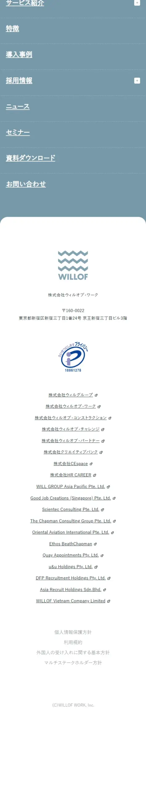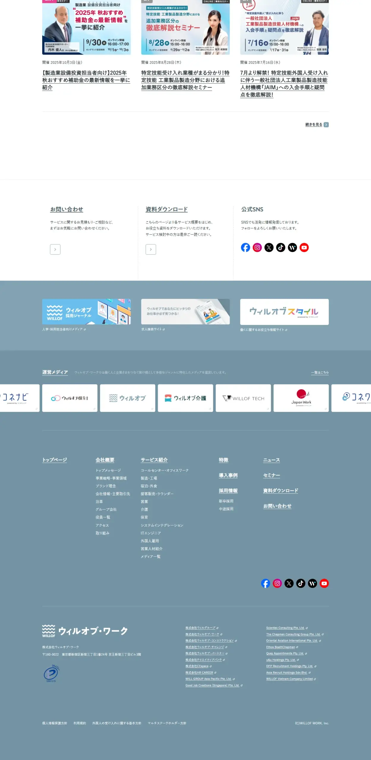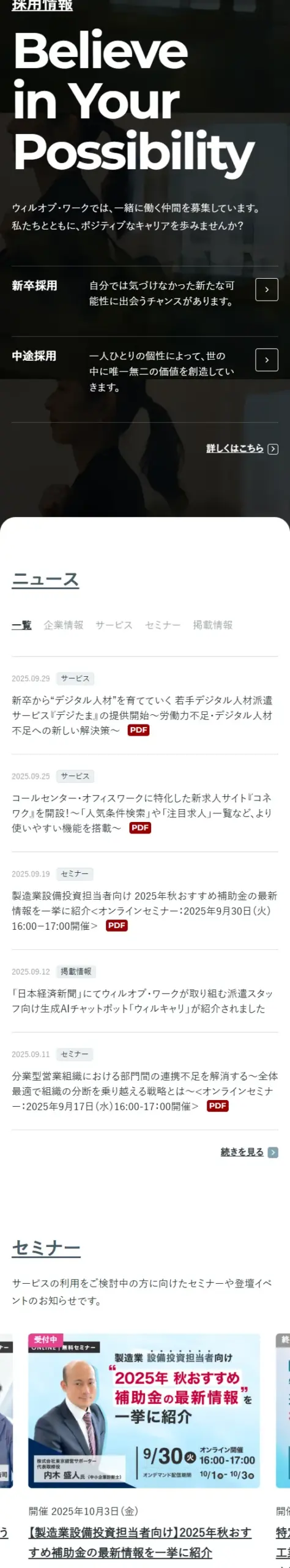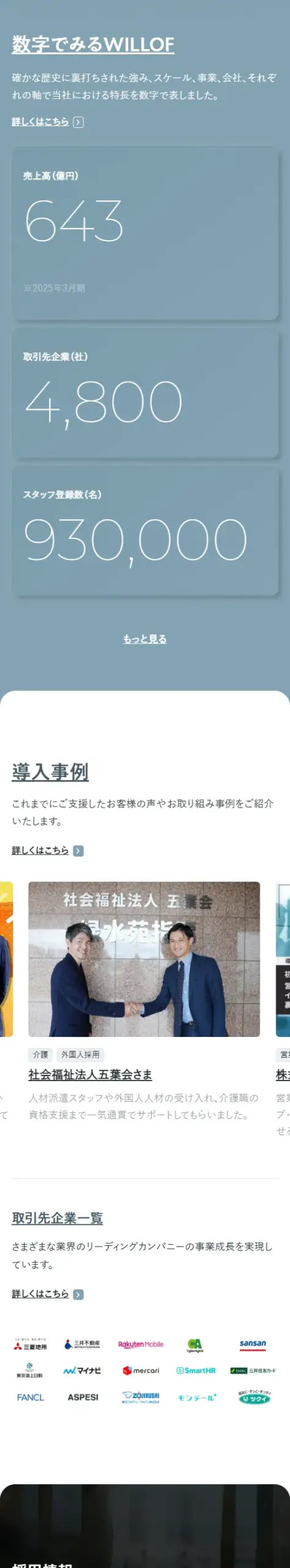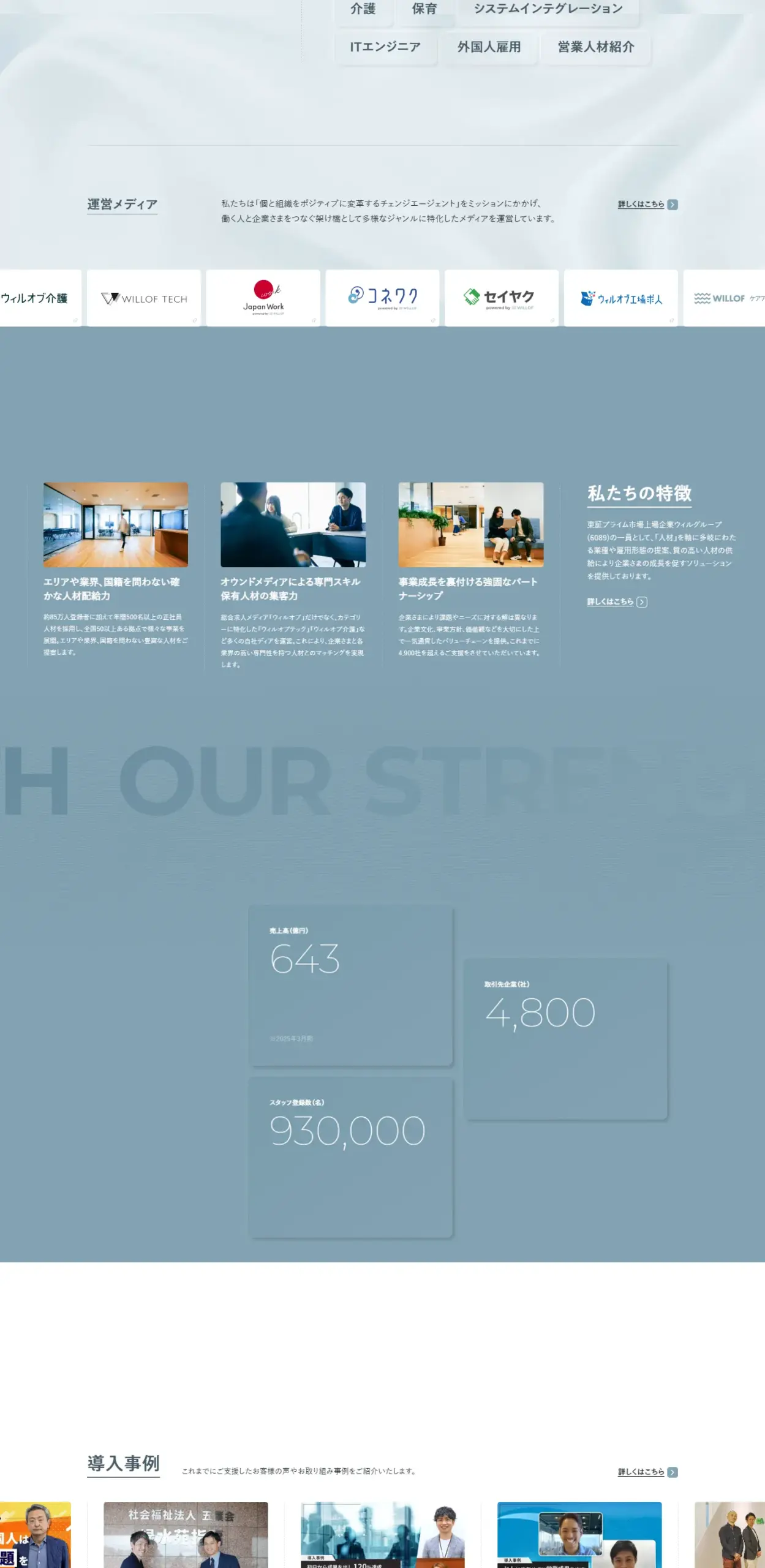 株式会社ウィルオブ・ワークの企業情報、サービスの紹介、ニュース、採用情報などをご紹介している公式企業サイトです。東証プライム市場上場企業(6089)ウィルグループの子会社として、ウィルオブ・ワークは人材派遣・紹介予定派遣事業、業務委託・請負運営事業、人材紹介事業、コンサルティング事業を提供しています。