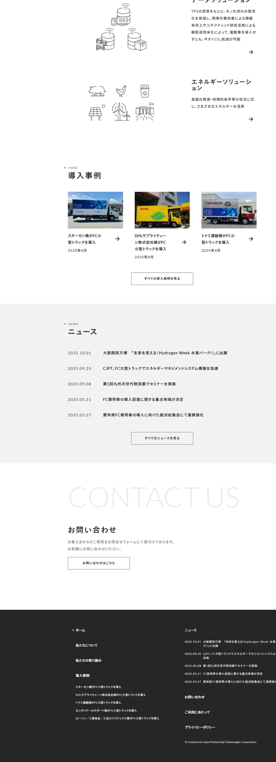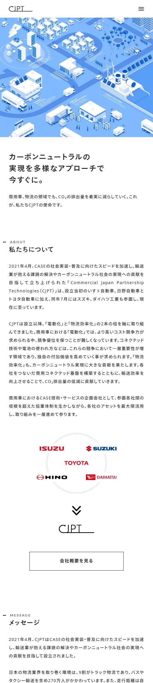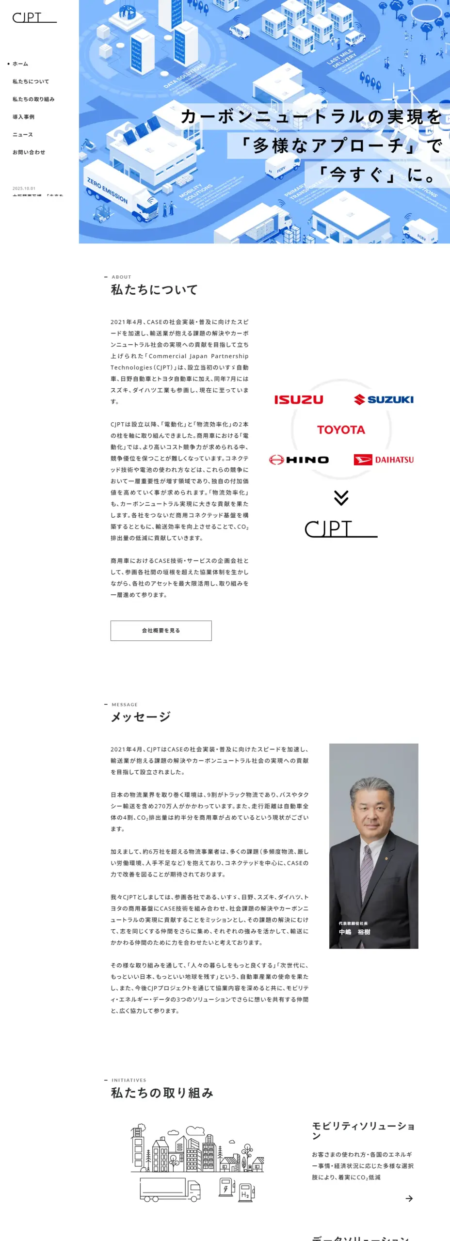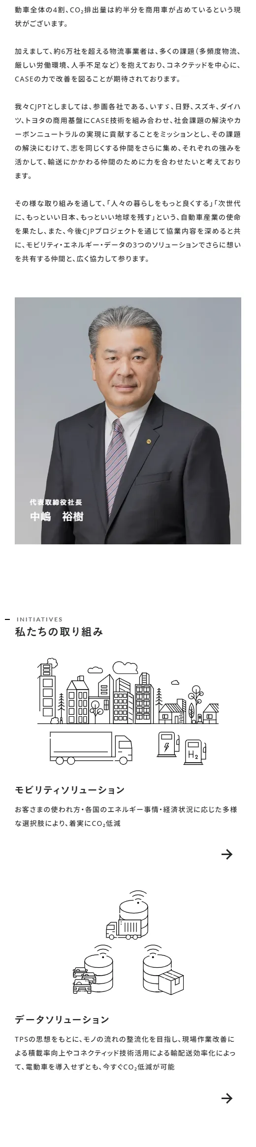CJPTは設立以降、「電動化」と「物流効率化」の2本の柱を軸に取り組んできました。商用車における「電動化」では、より高いコスト競争力が求められる中、競争優位を保つことが難しくなっています。コネクテッド技術や電池の使われ方などは、これらの競争において一層重要性が増す領域であり、独自の付加価値を高めていく事が求められます。「物流効率化」も、カーボンニュートラル実現に大きな貢献を果たします。各社をつないだ商用コネクテッド基盤を構築するとともに、輸送効率を向上させることで、CO₂排出量の低減に貢献していきます。
