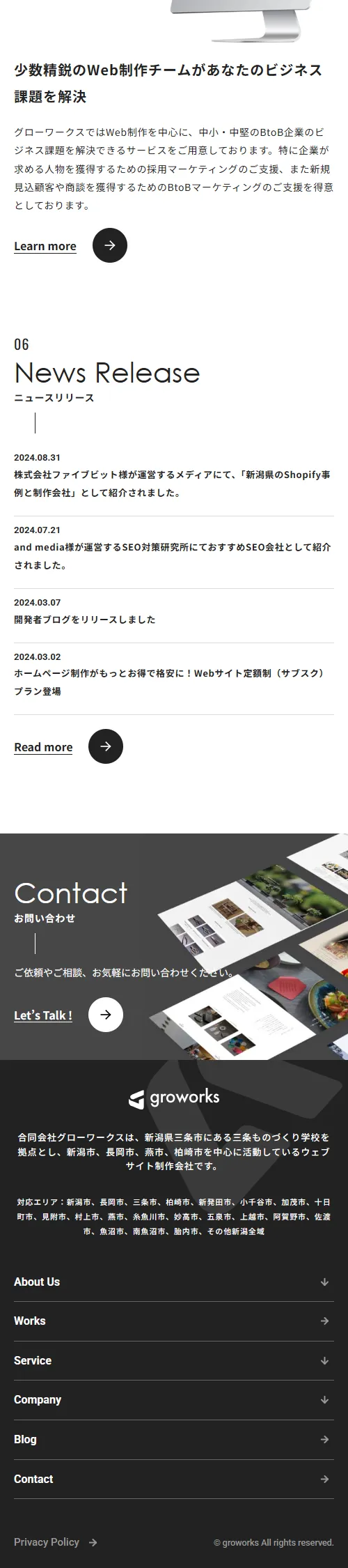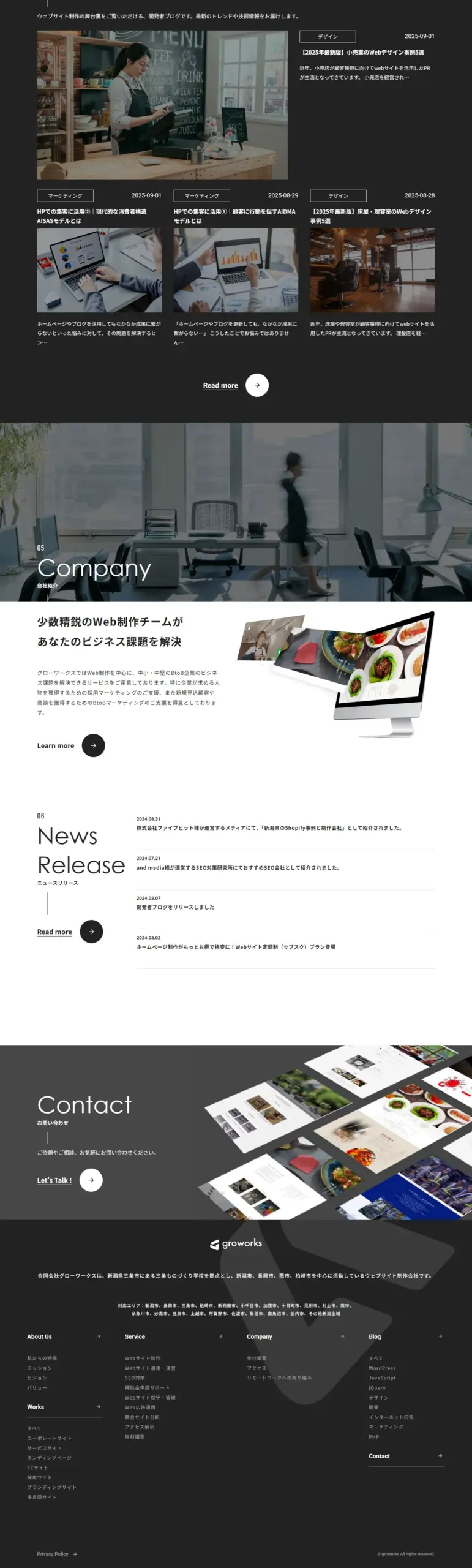 合同会社グローワークスは新潟県三条市のWEBサイト制作、ホームページ制作会社です。ものづくりのまち燕三条にある三条ものづくり学校を拠点とし、新潟市、長岡市、燕市、柏崎市を中心に活動しているウェブサイト制作会社です。見た目の美しさだけでなく、ユーザーの体験や感情など見えないもののデザインを大切にしています。