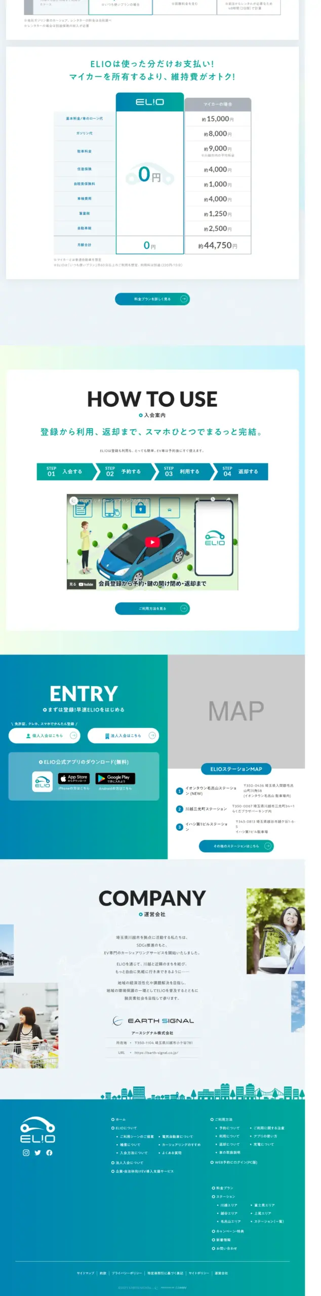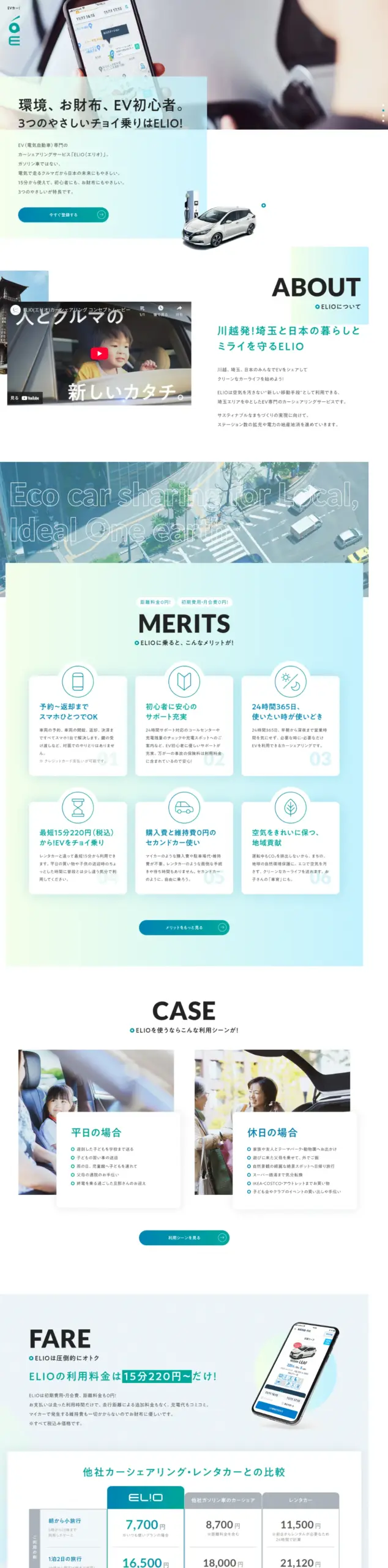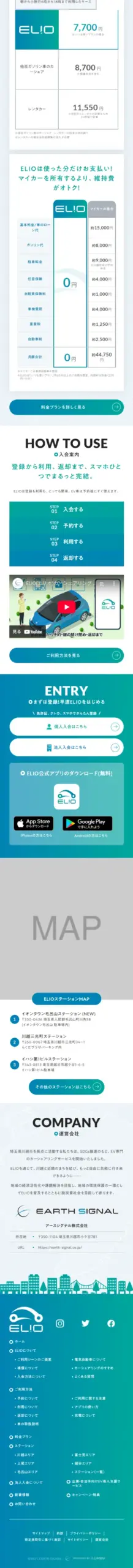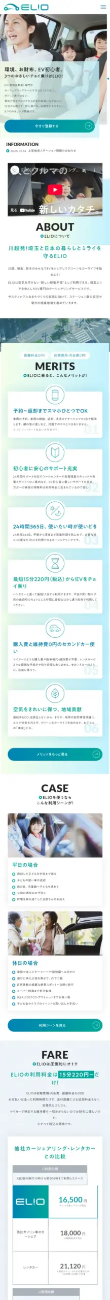 【初期費用・入会費無料】「ELIO」(エリオ)は川越エリアにある初心者にやさしい電気自動車(EV)専門カーシェアリングサービスです。電気で走るから地球にも、お財布にもやさしく。3つのやさしいチョイ乗りを実現します。15分220円からご利用可能。