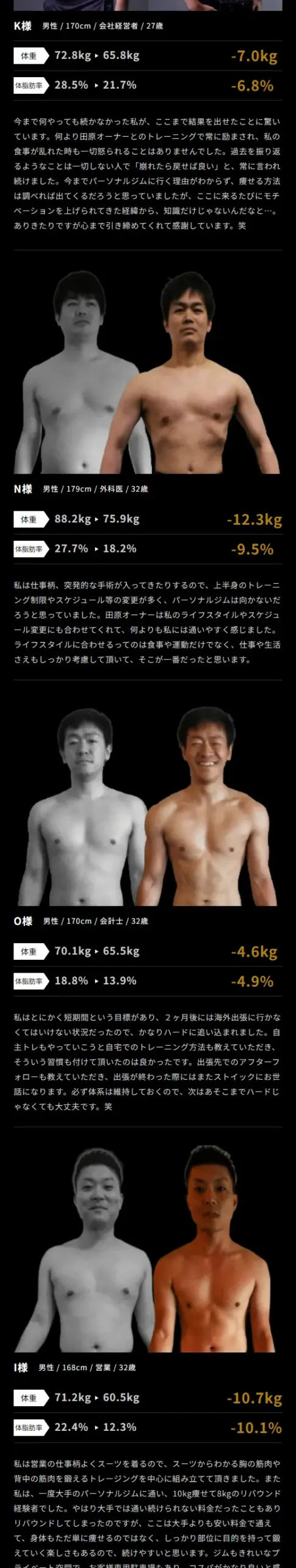 プライベートジムKINGとは、男性の肉体改造に特化したパーソナルトレーニングジムです。「バキバキに割れた上半身の身体」「細身のシルエットの綺麗な身体」「胸板が厚いゴツ目の身体」それぞれのお客様で理想の身体は異なり、それを目指すストイックな姿に、男の格好良さが漂う。「理想の自分を追及する男が何よりも格好良い」と・・・。プライベートジムKINGでだらしなかった自分を捨て、理想の身体と自信に満ち溢れた人生を共に作りましょう!