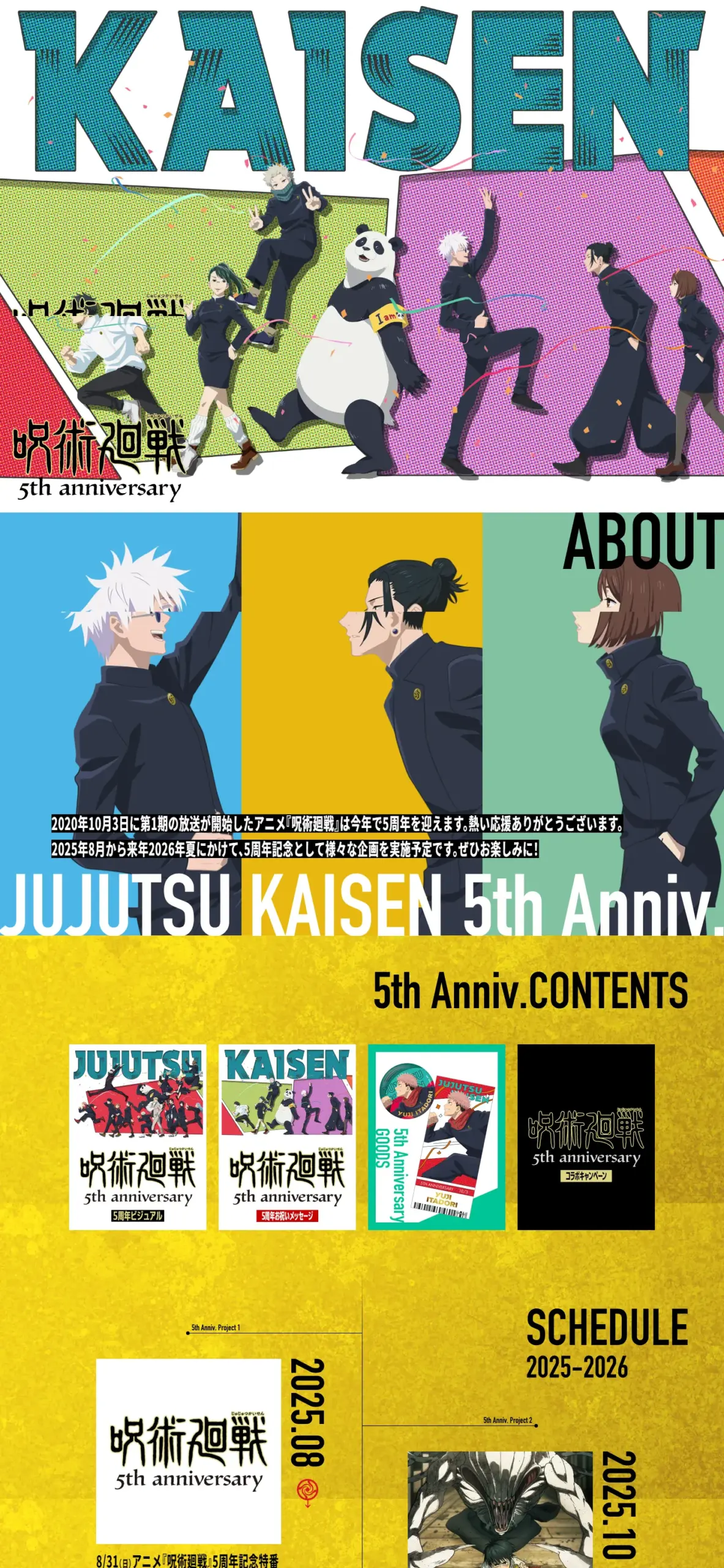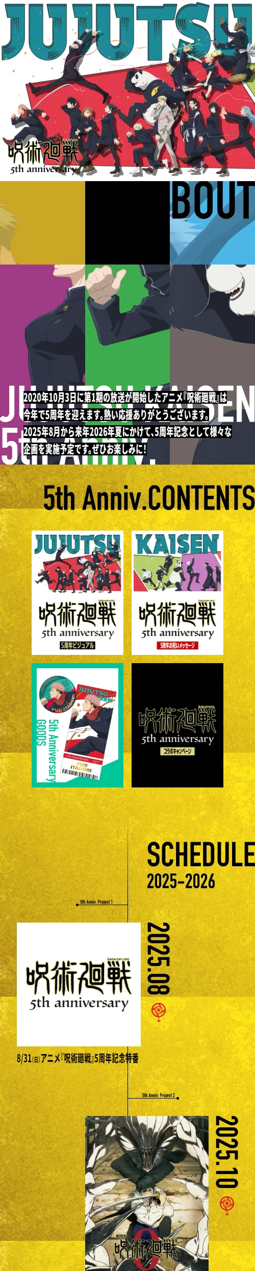 2020年10月3日に第1期の放送が開始したアニメ『呪術廻戦』は今年で5周年を迎えます。熱い応援ありがとうございます。2025年8月から来年2026年夏にかけて、5周年記念として様々な企画を実施予定です。ぜひお楽しみに!