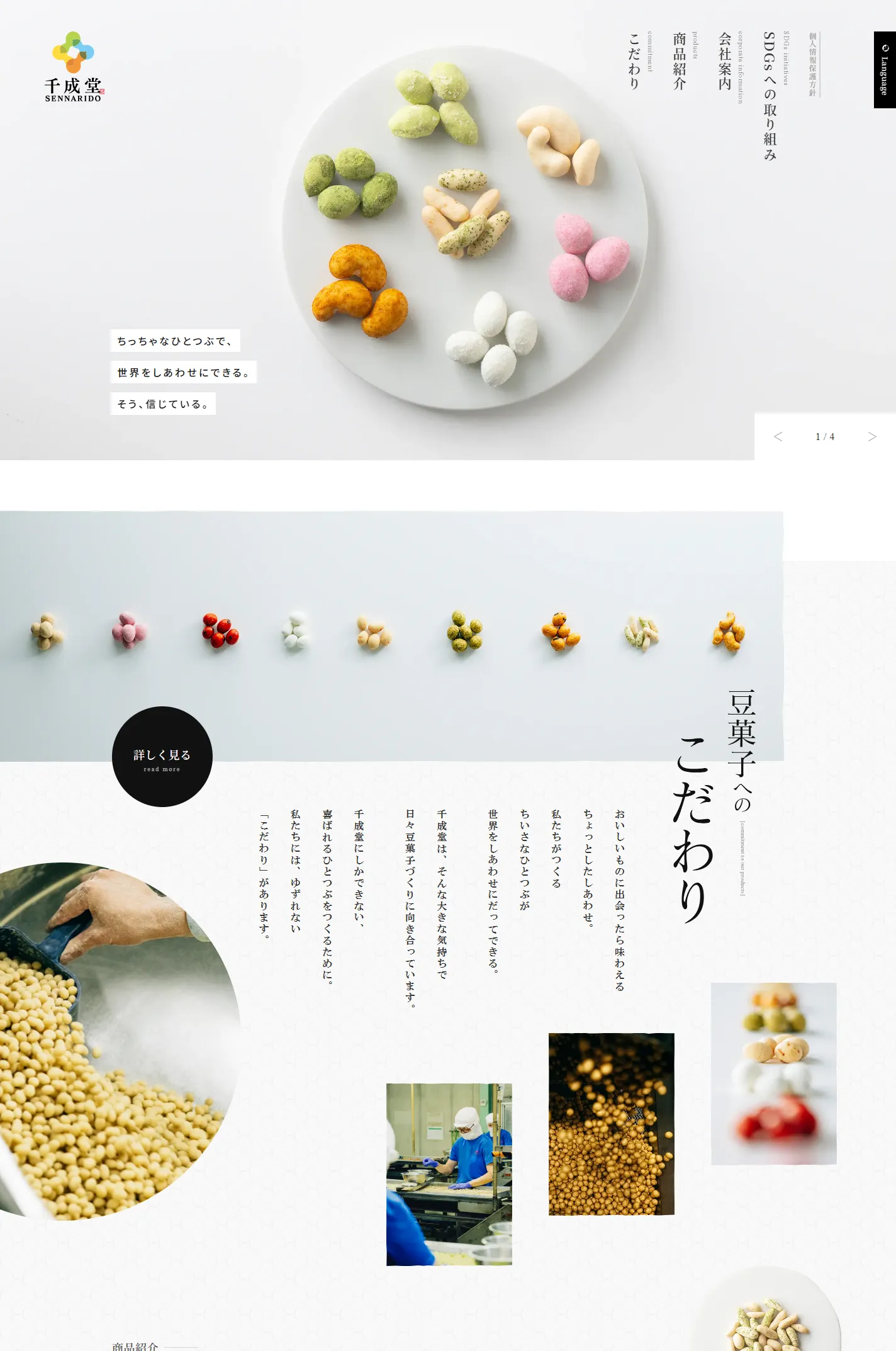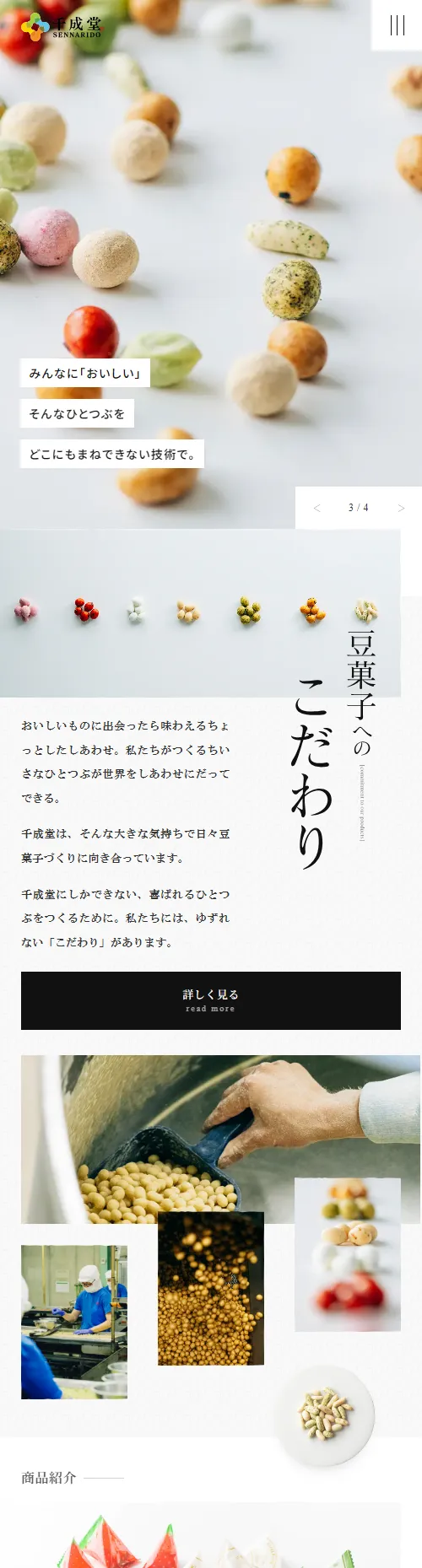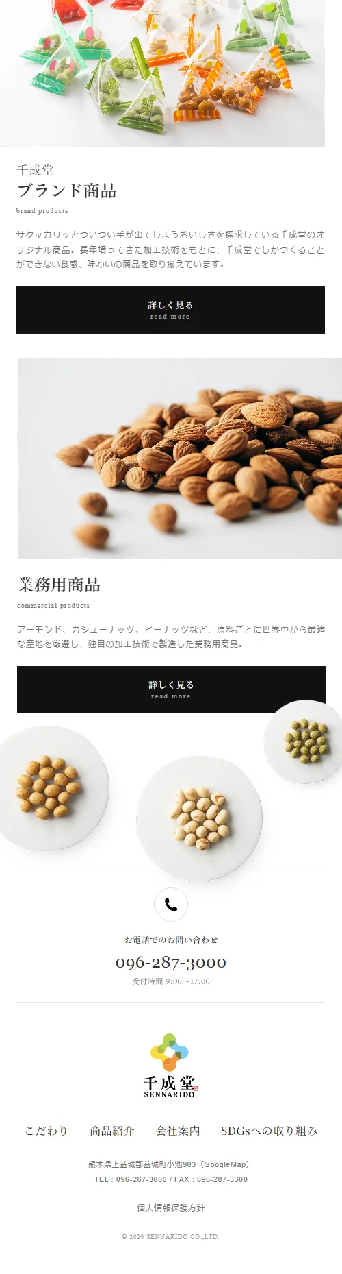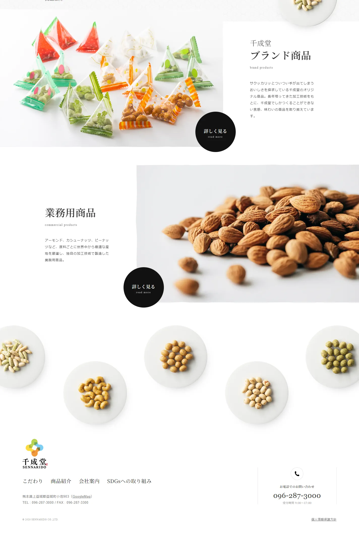 熊本県上益城郡益城町を拠点に、豆菓子・ナッツ類製造・販売等を行う千成堂の公式Webサイト。創業70年以上の長い歴史の中で積み重ねてきた技術によって独自の商品を展開しています。