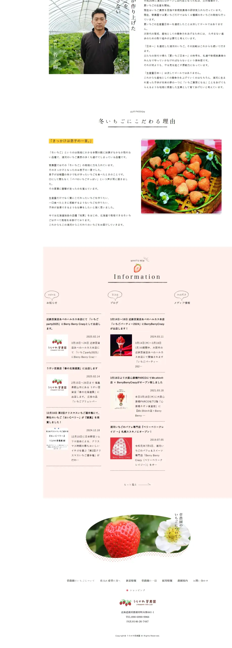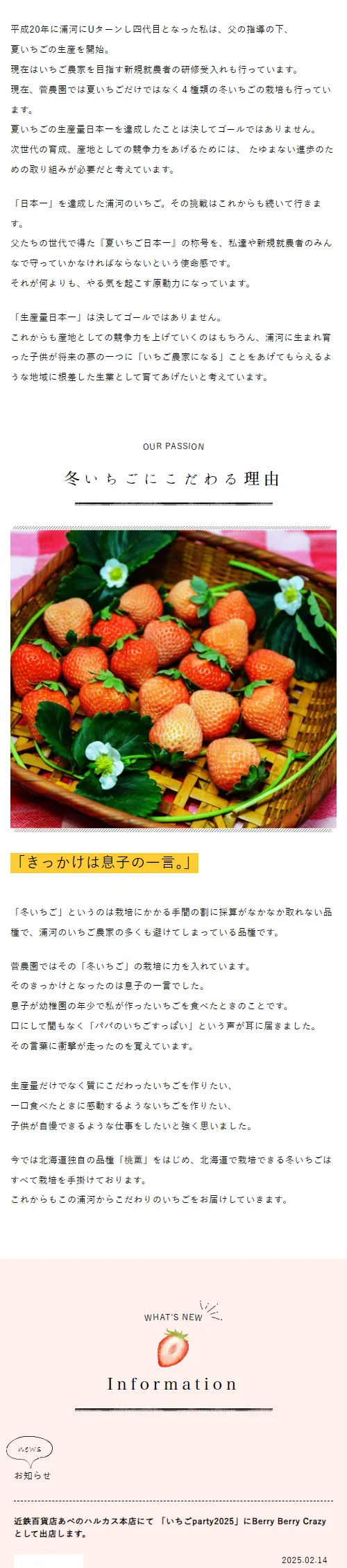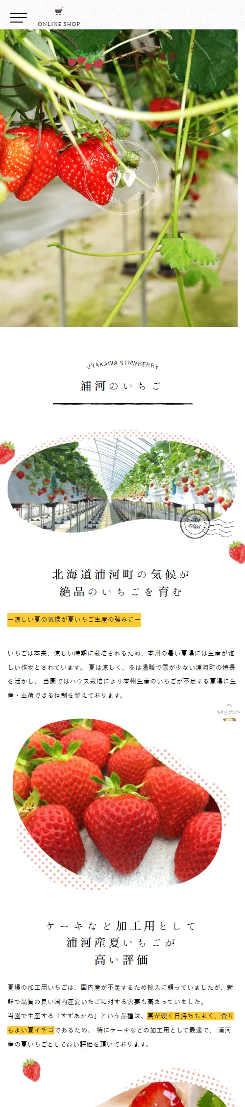夏イチゴ生産量日本一の北海道浦河町の中でも老舗のいちご農園です。北海道生まれの「桃薫」をはじめとする冬イチゴなど、こだわりのいちごを農場直送で通信販売も行っております。冬は温暖で雪の少ない特徴をいかした浦河町ならではの気候が育む絶品のいちごをご堪能ください。