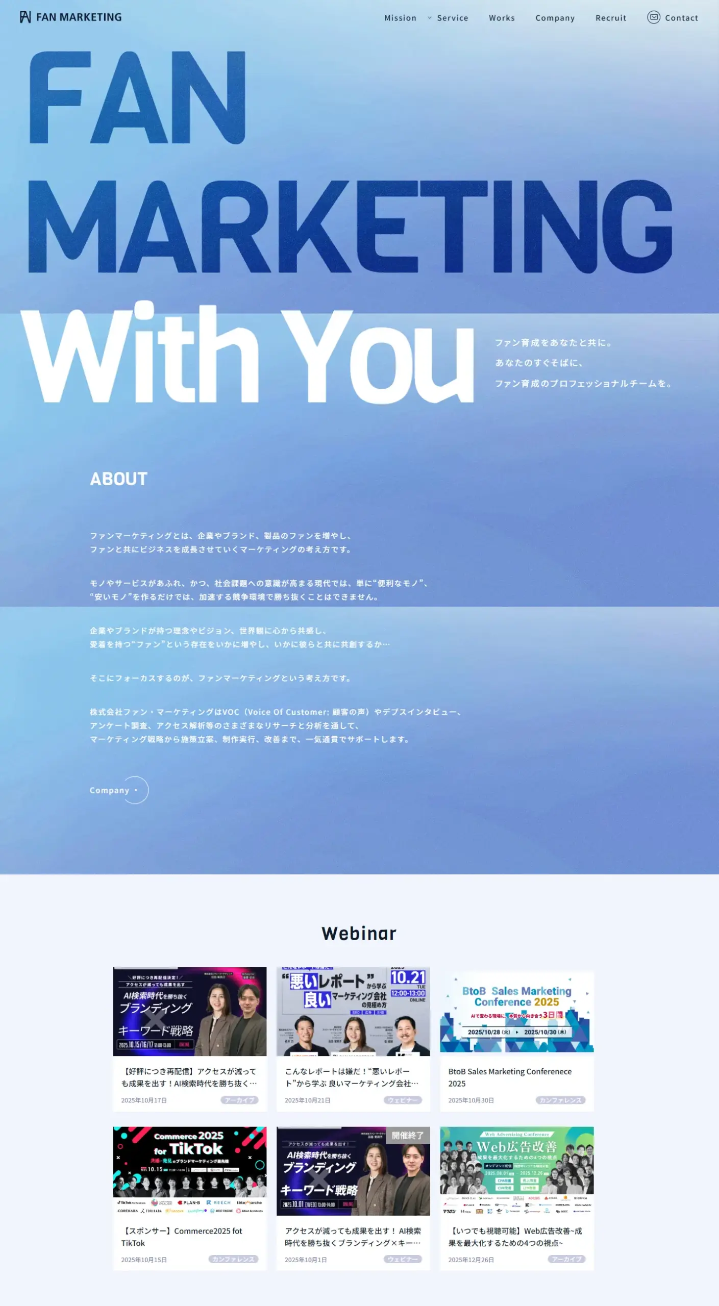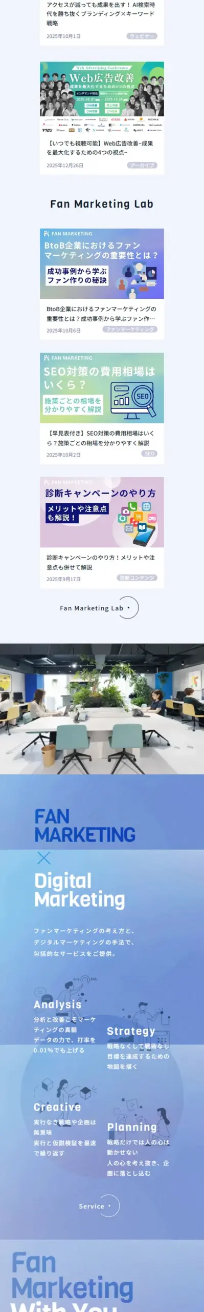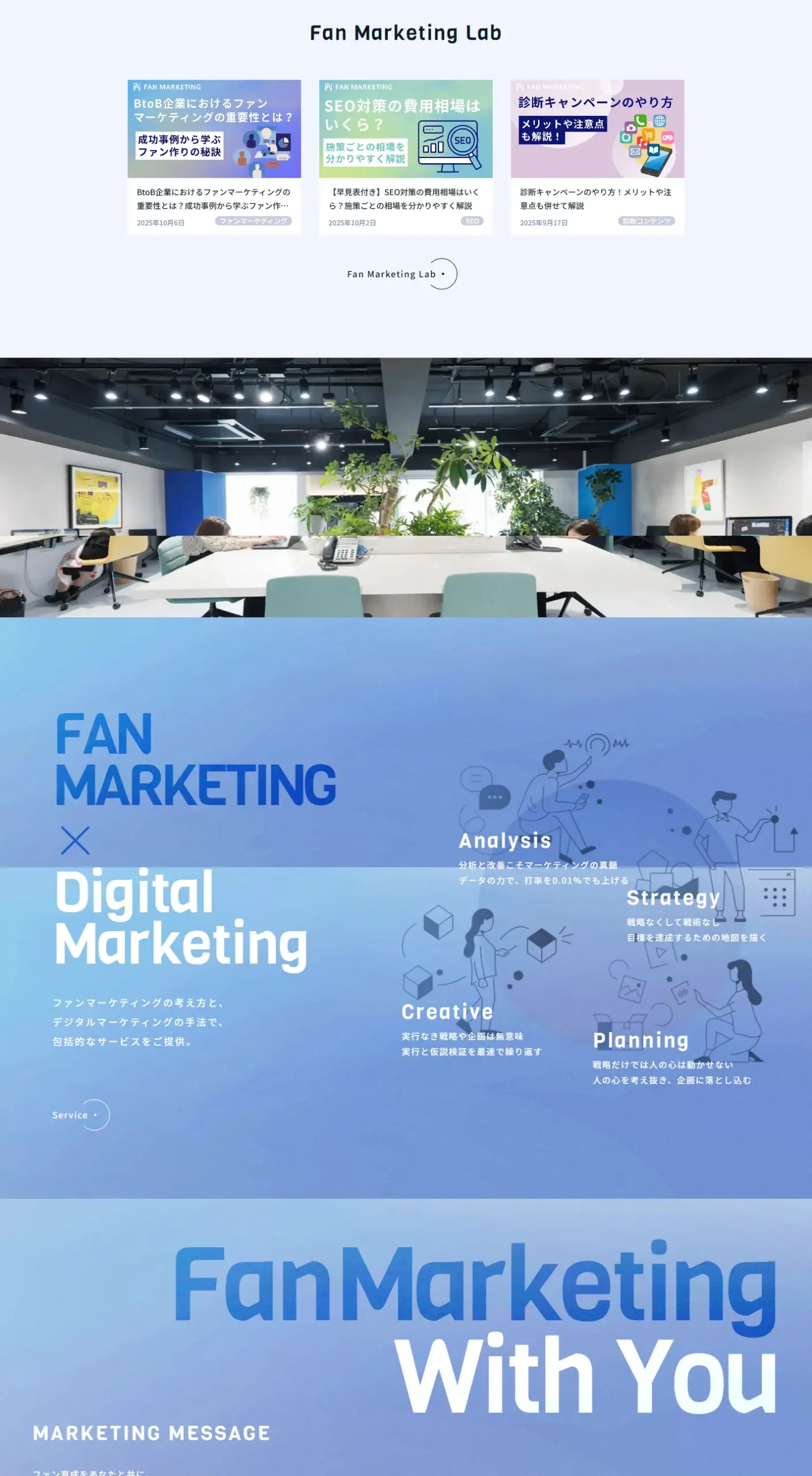 株式会社ファン・マーケティングはWebサイトやコンテンツ制作をはじめとしたウェブマーケティング施策を通じて、お客様のファン育成に取り組む、マーケティングコンサルティング企業です。