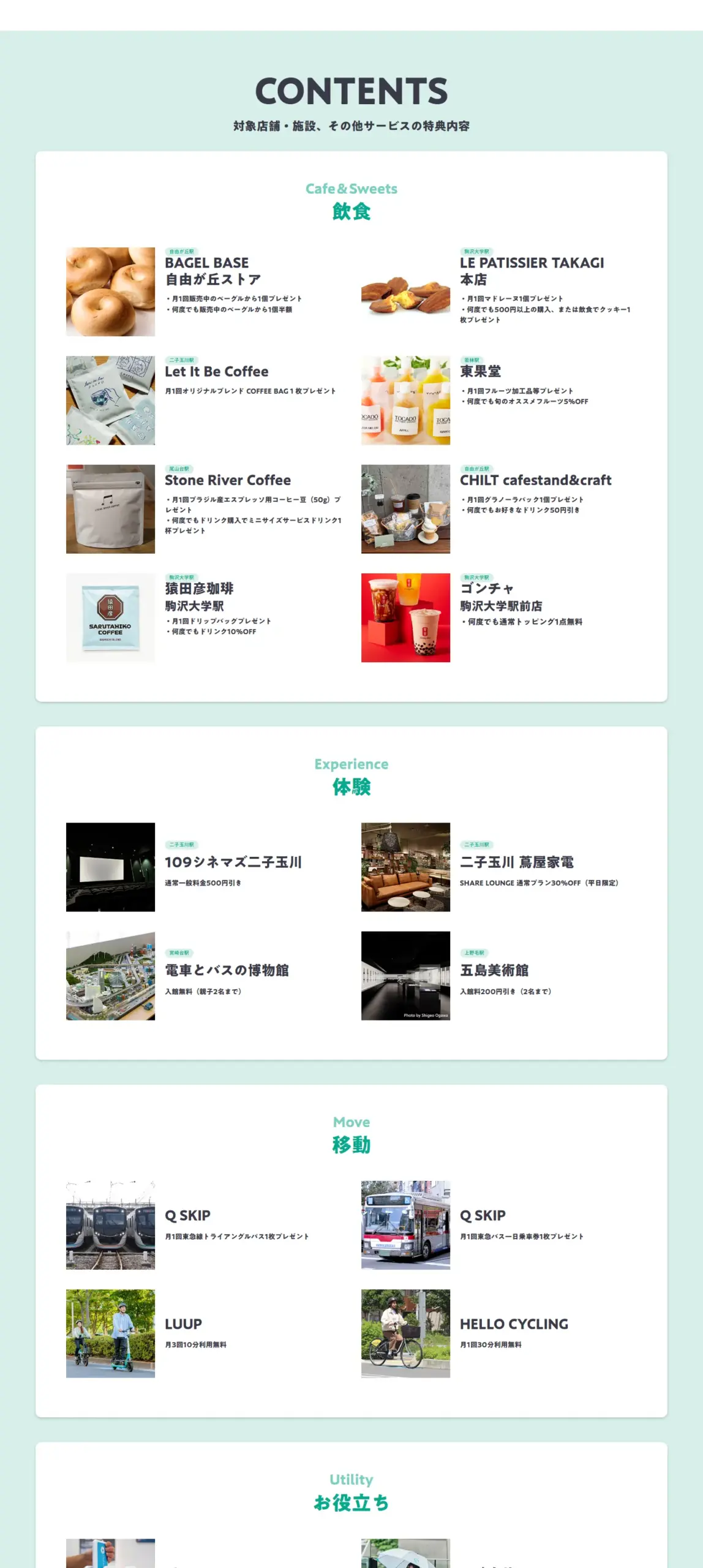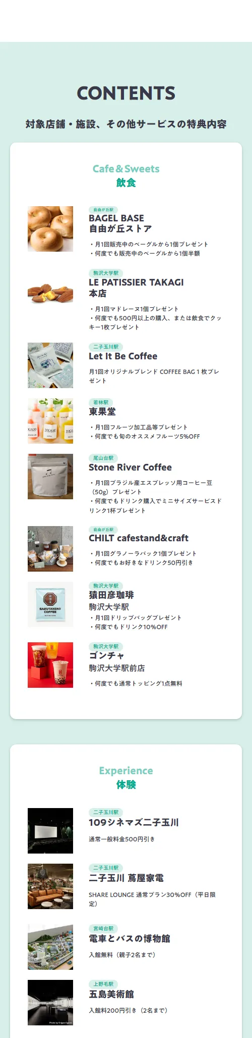 駒沢・二子玉川・自由が丘エリアを中心に電車やバスなどの移動手段と、映画、カフェにスイーツまで、街を楽しむ体験が詰まったおトクなサービス!