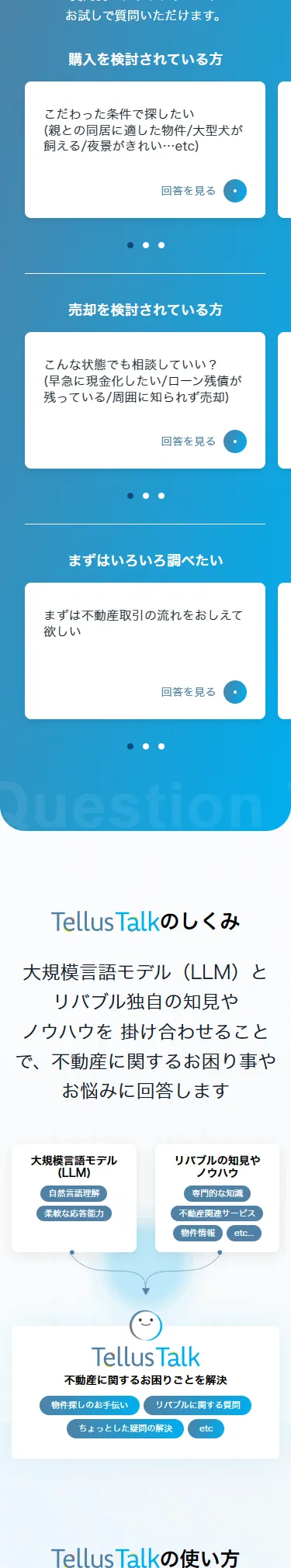 不動産の悩みをいつでも相談。リバブルの不動産AIアドバイザー「Tellus Talk(テラストーク)」が、チャット形式で質問に即回答。独自のノウハウを学習した生成AIが、売買など不動産取引のお困りごとをサポートします。