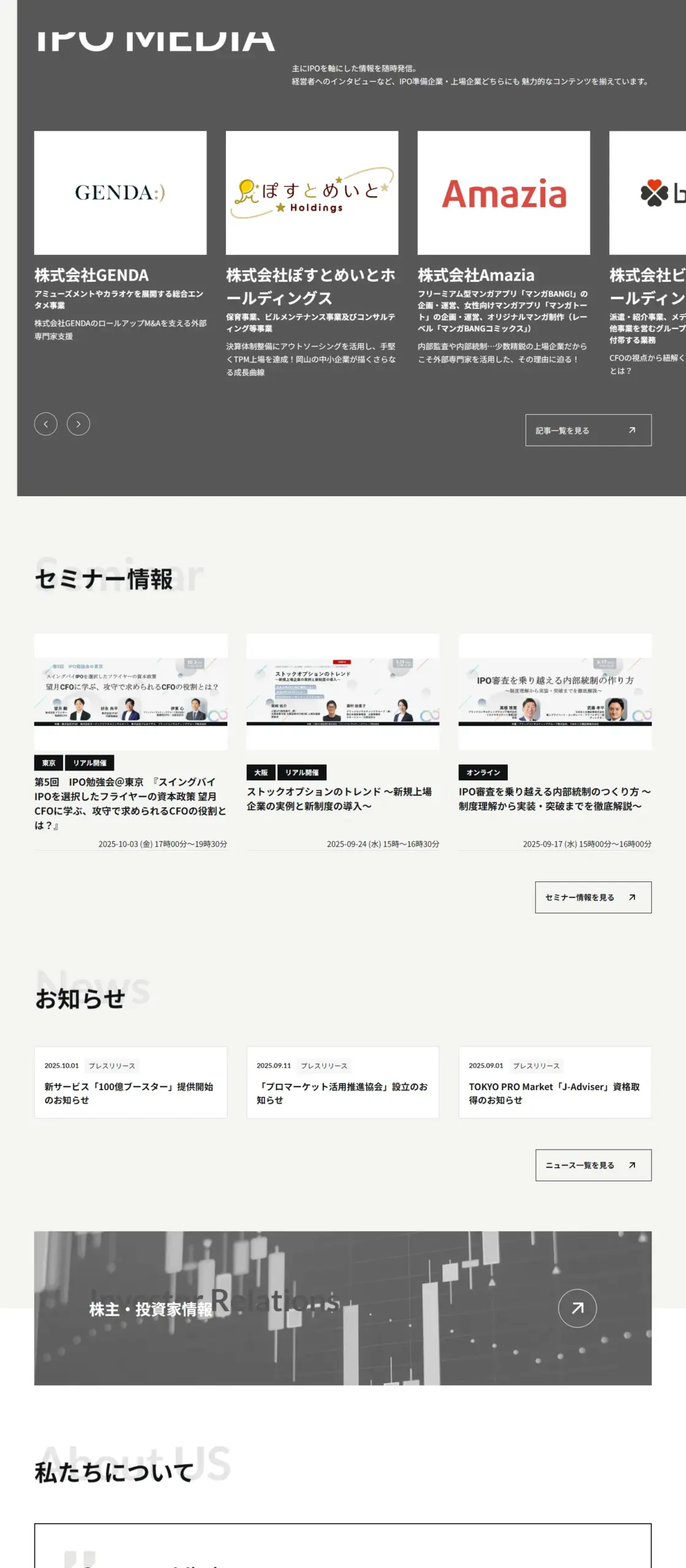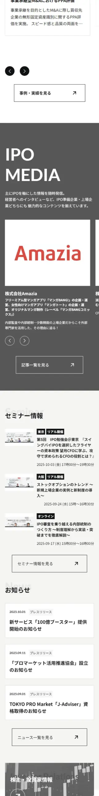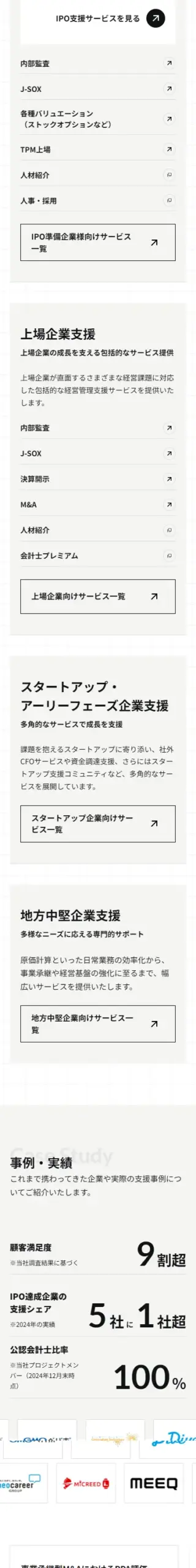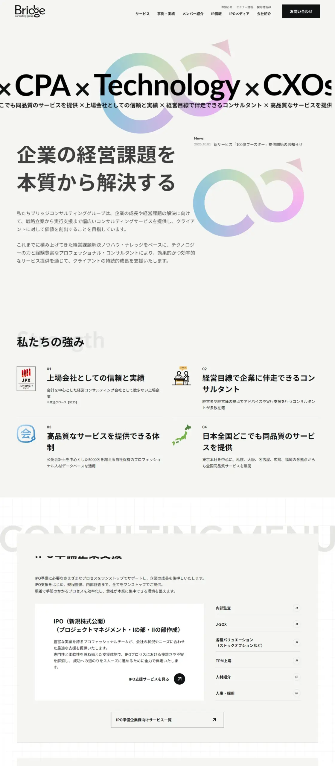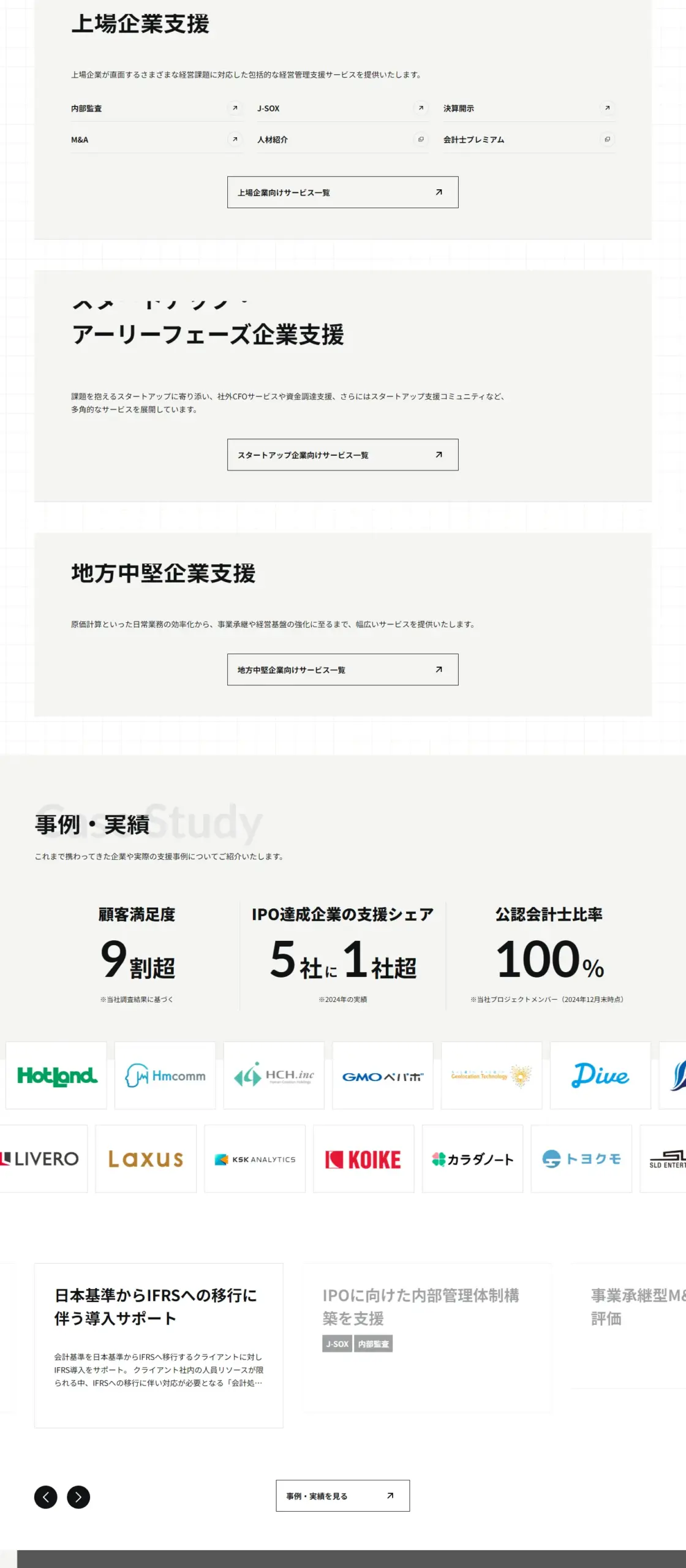 公認会計士人材の知見・経験を活用した経営支援サービスを展開するプロフェッショナルファームです。IPO/M&A支援、リスクマネジメント、アカウンティング、ファイナンシャルアドバイザリー、人材紹介等。