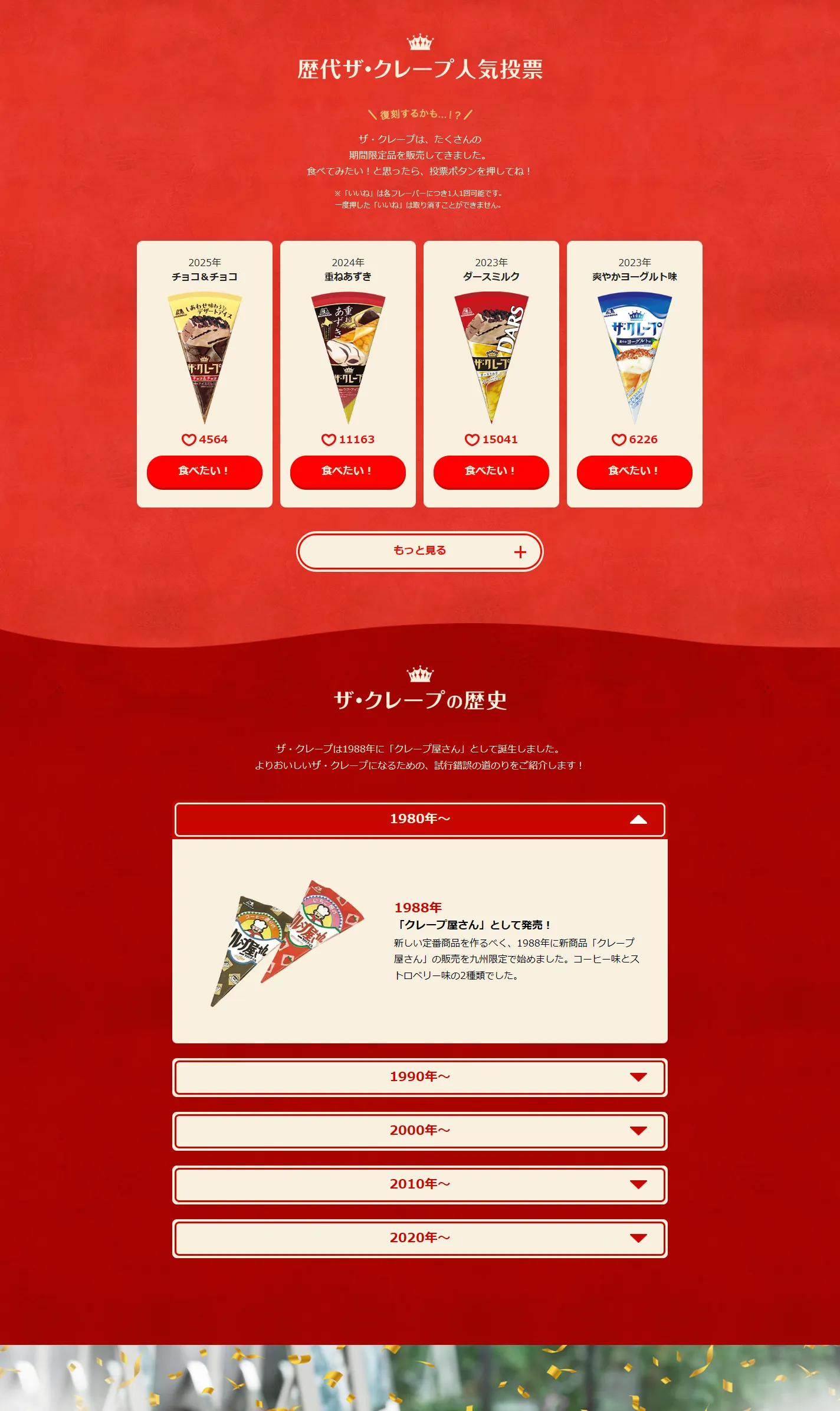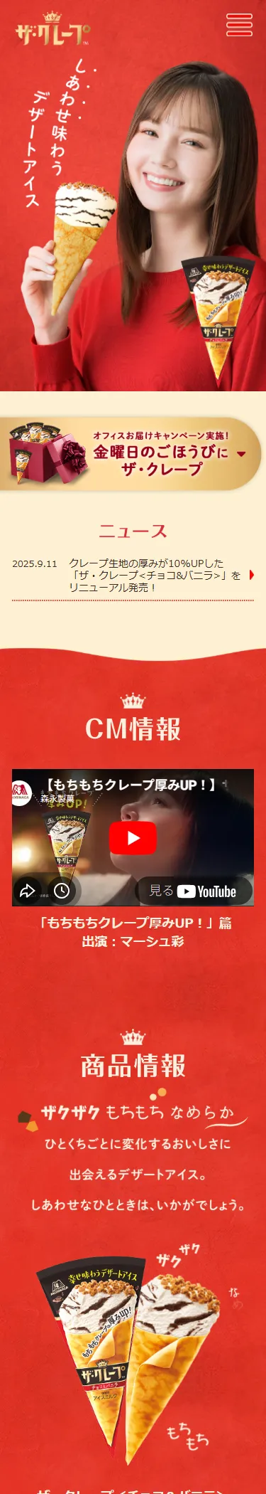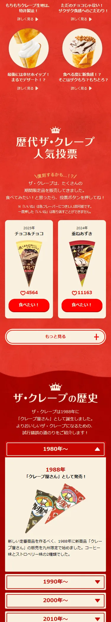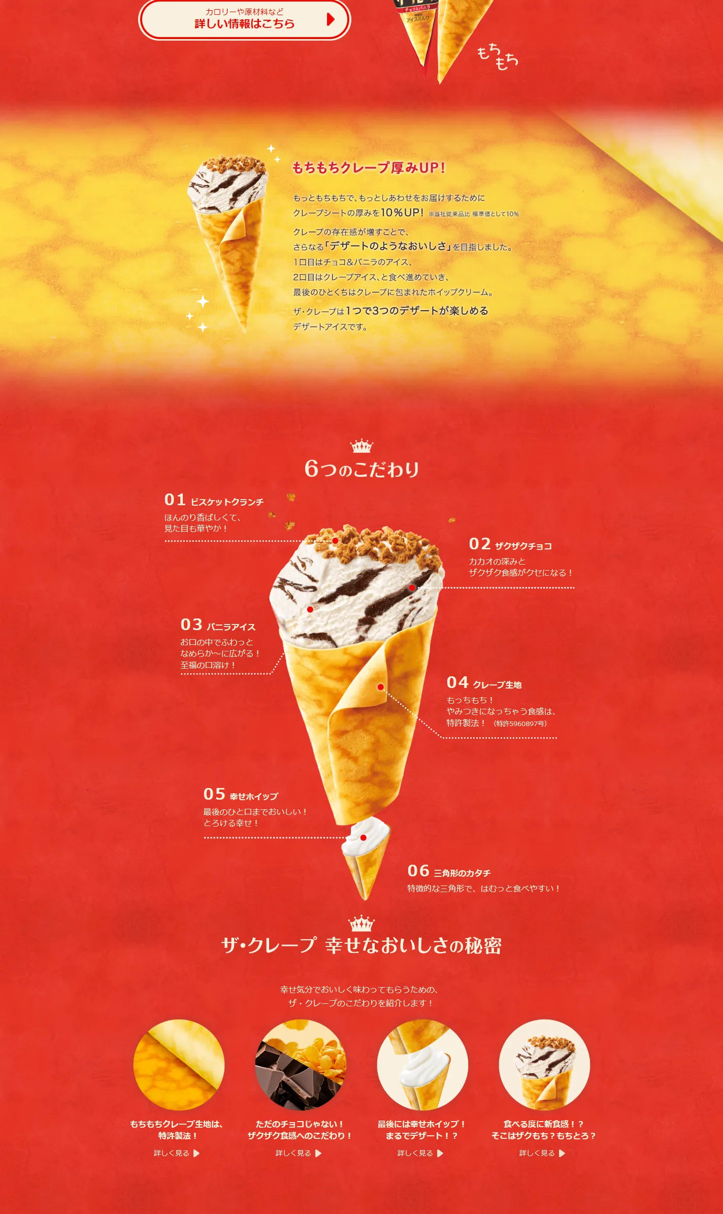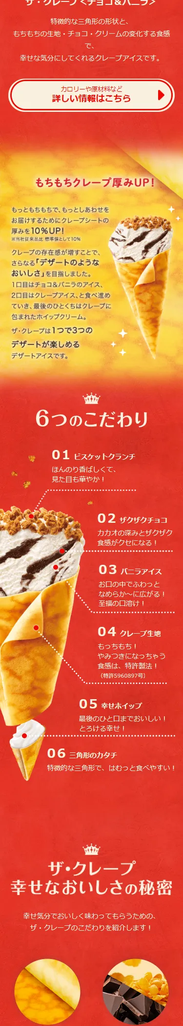 「しあわせ味わうデザートアイス」ザ・クレープのブランドサイトです。商品情報や6つのこだわり、幸せなおいしさの秘密をご紹介します!歴代ザ・クレープの人気投票や、ザ・クレープの歴史など。