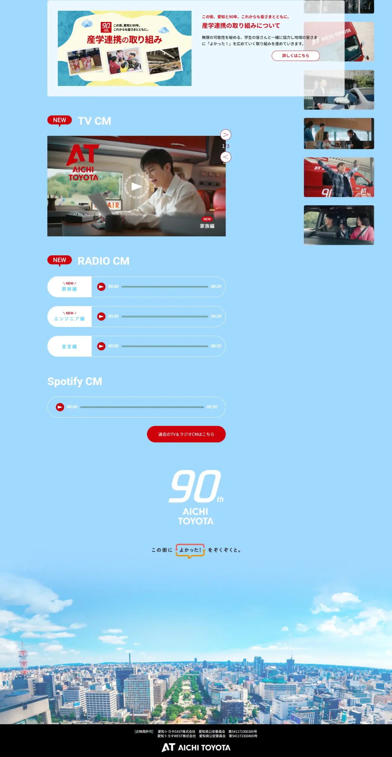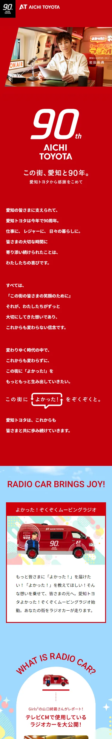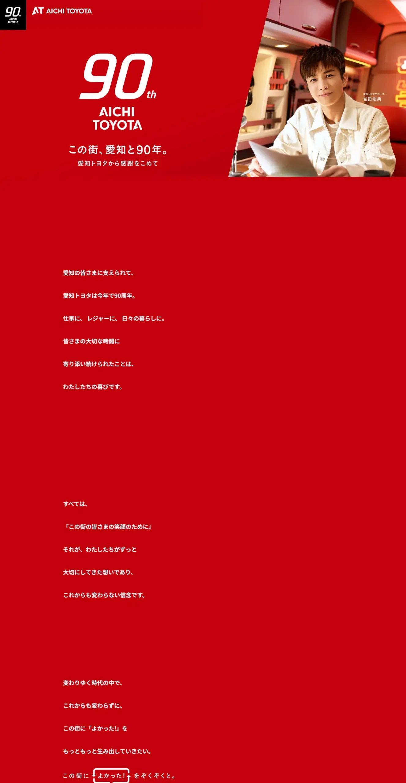 愛知の皆さまに支えられて、愛知トヨタは今年で創業90周年。岩⽥剛典さんが出演しているテレビCMなど、90周年を盛り上げるスペシャルコンテンツを掲載しています。
