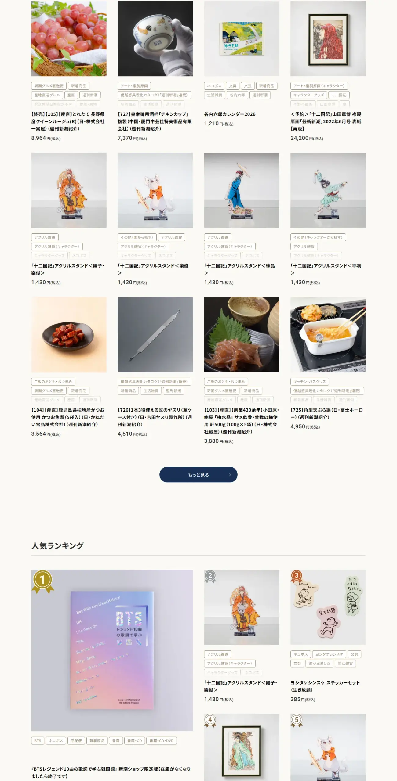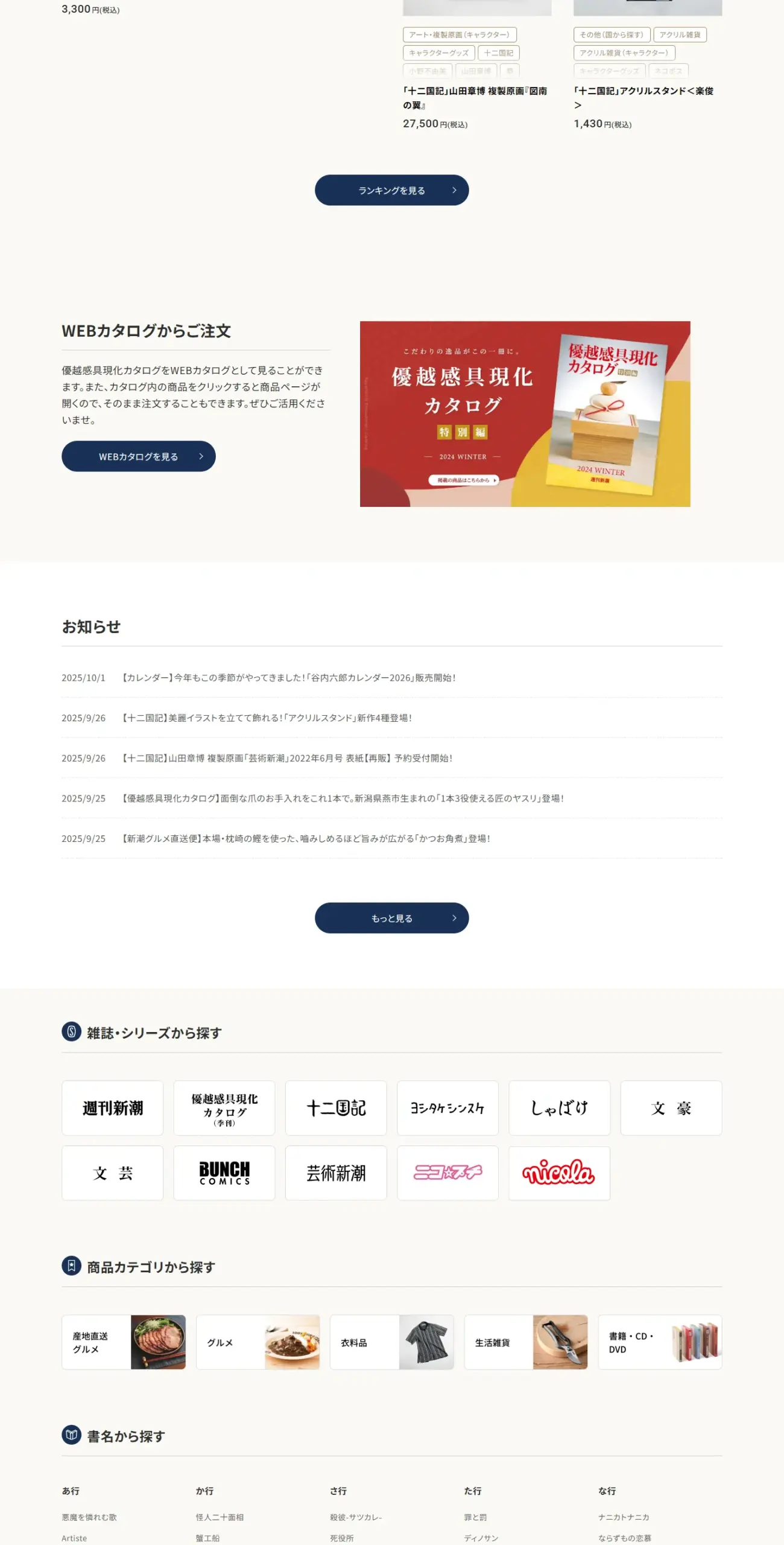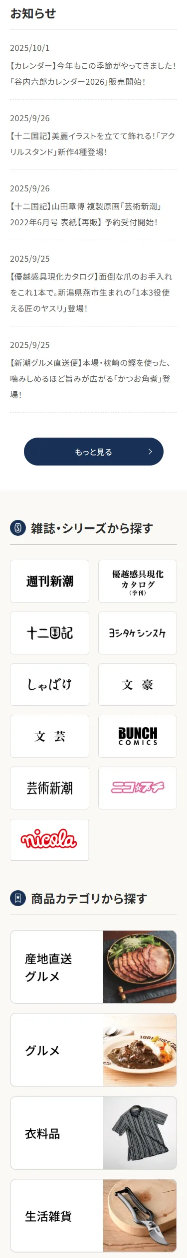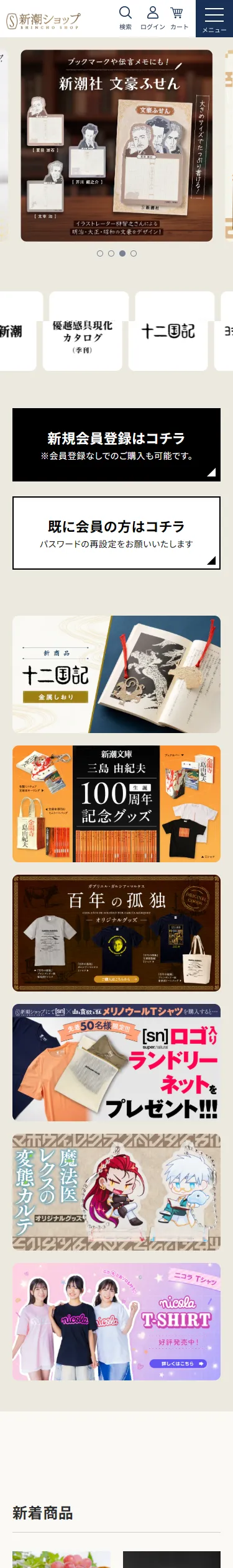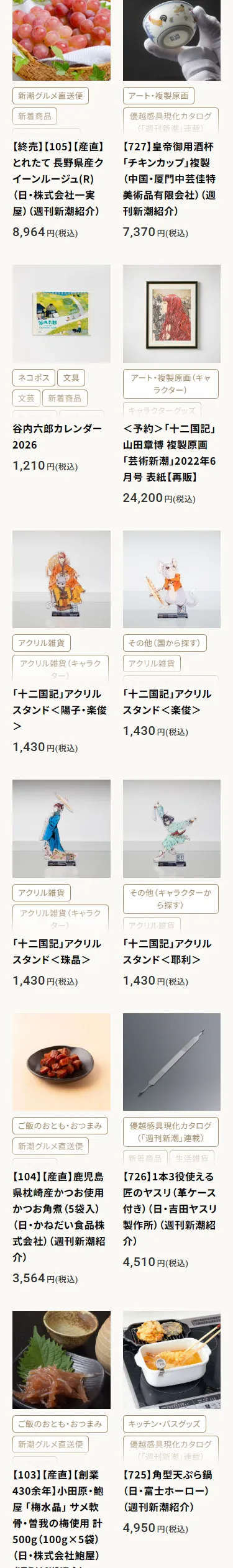 【新潮社の公式通販サイト】「十二国記」や「しゃばけ」など弊社刊行文芸作品に関するグッズ、「山と食欲と私」「極主夫道」「漫画太郎」などコミックグッズ、太宰治や夏目漱石など文豪グッズ、「週刊新潮」掲載のお取り寄せグルメなどを販売中です。