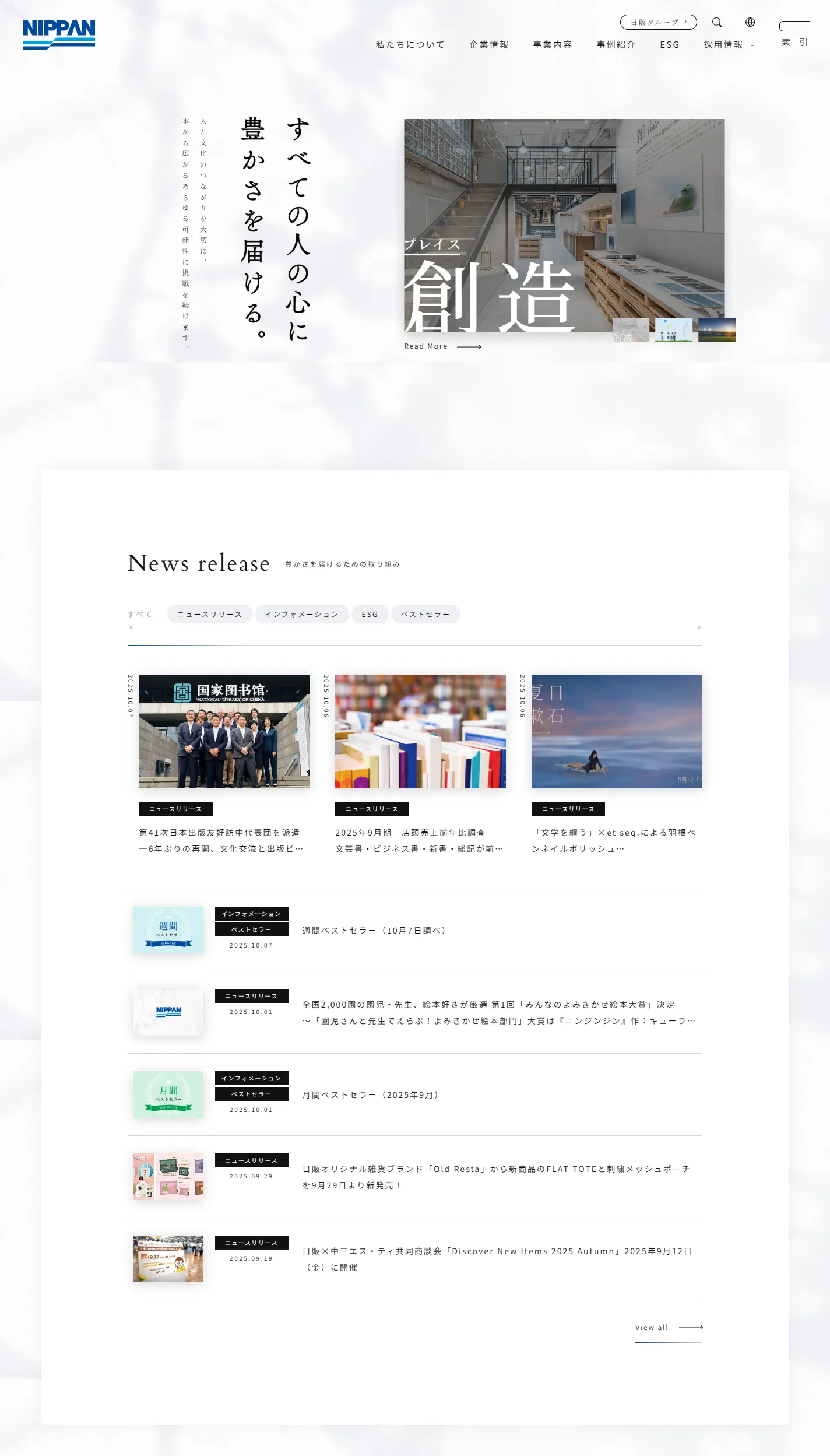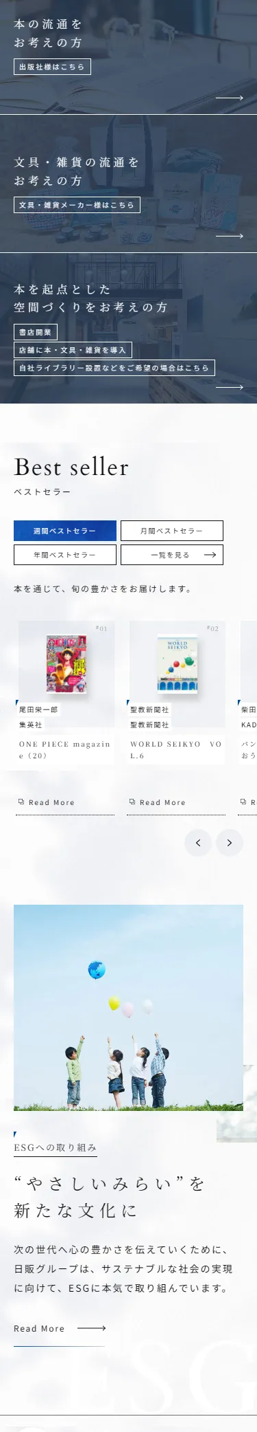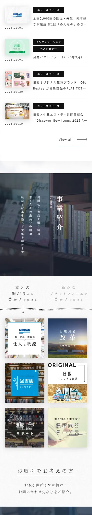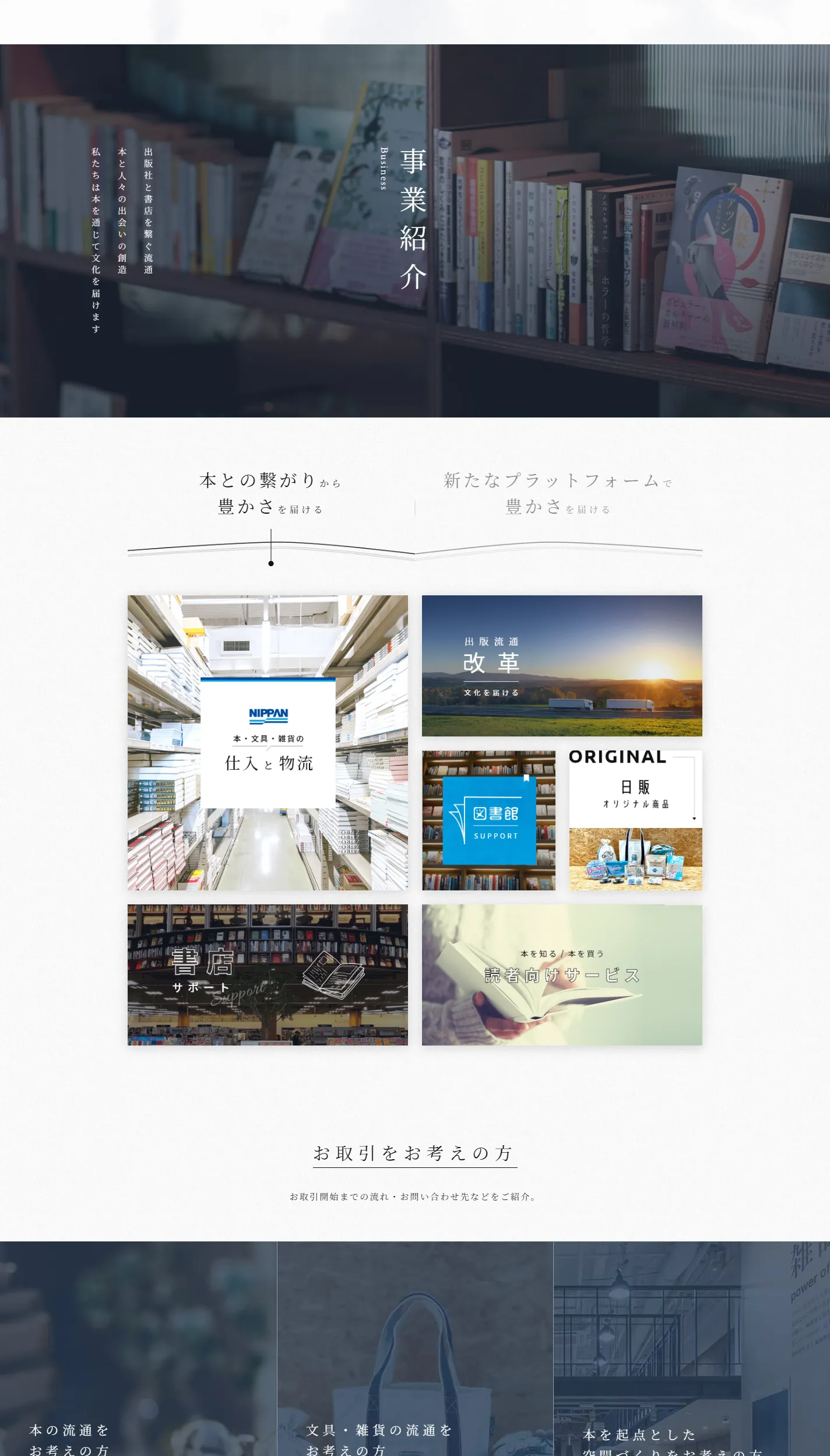 私たち日本出版販売株式会社(日販)は、1949(昭和24)年の創業以来、書籍・雑誌の流通を担う出版販売会社(出版取次)として、文化の普及発展に貢献すべく、不断の努力を続けてまいりました。現在では国内最大規模の出版販売会社としての地位を確固たるものとしております。