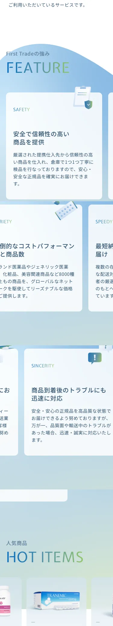 海外医薬品・化粧品・サプリメント等、安心で信頼性の高い商品を提供、輸入などをサポートいたします。First Trade Ltd.(ファーストトレード)は、アジア有数の自由貿易都市「香港」にて取次業務に携わる会社です。