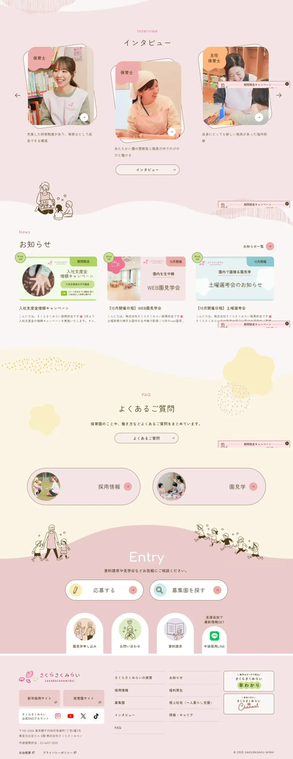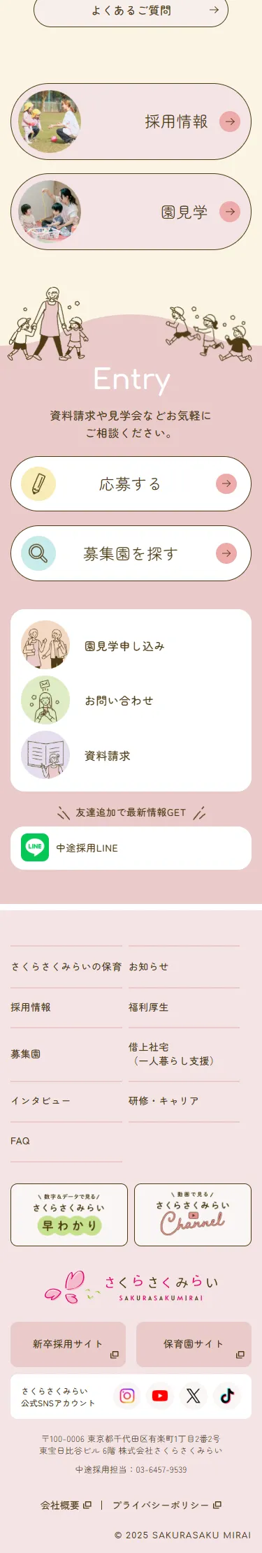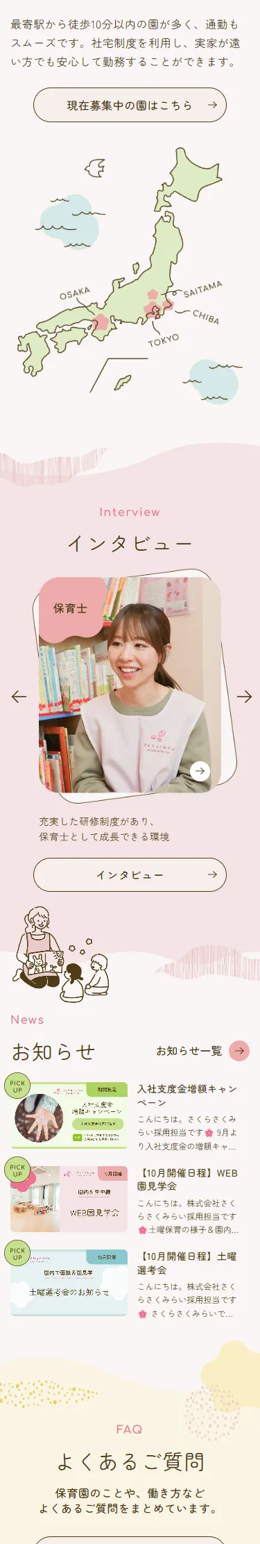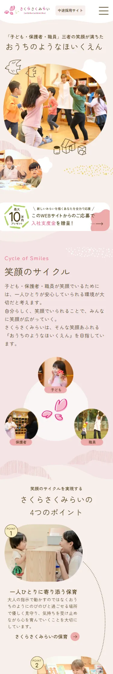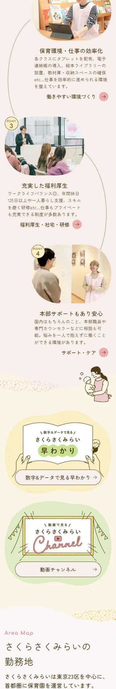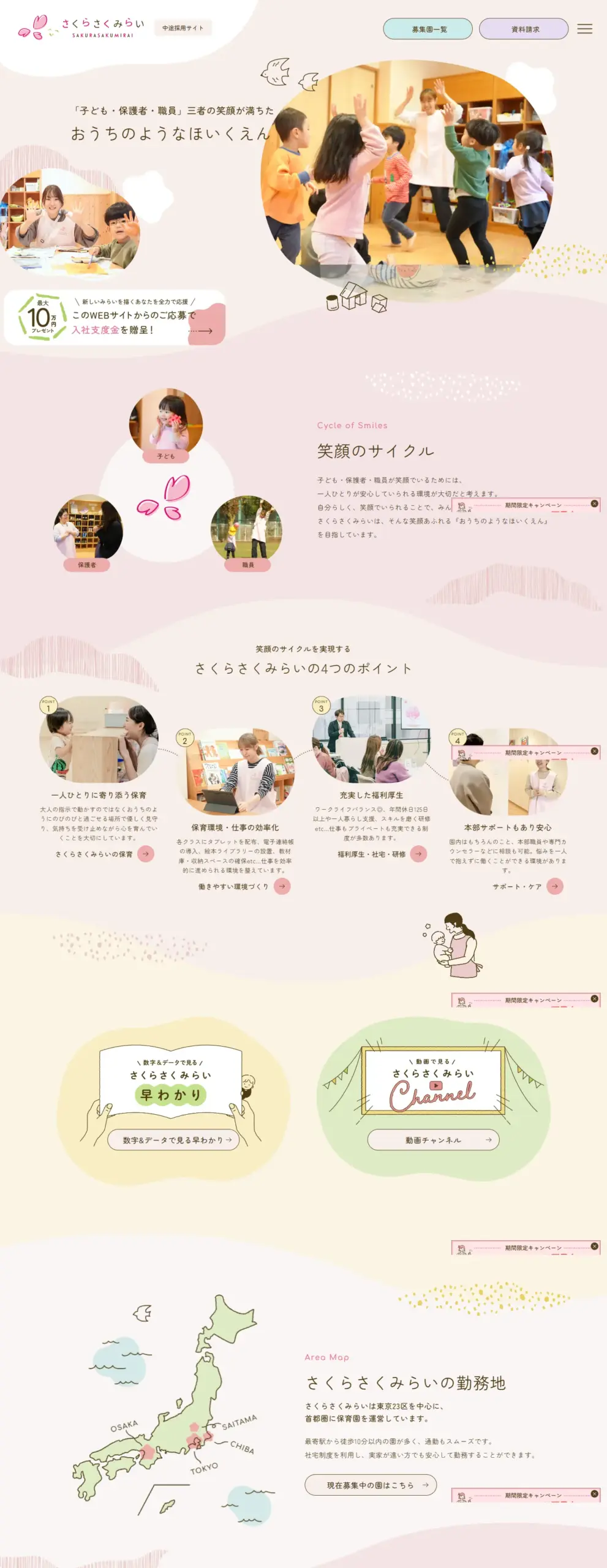 【公式】さくらさくみらい中途採用サイトです。東京・千葉・埼玉・大阪89園の保育園の最新の募集状況をご確認いただけます。このHPからのエントリーで入社支度金10万円を進呈!1人ひとりのキャリアや悩みに採用担当が寄り添いサポートします。
