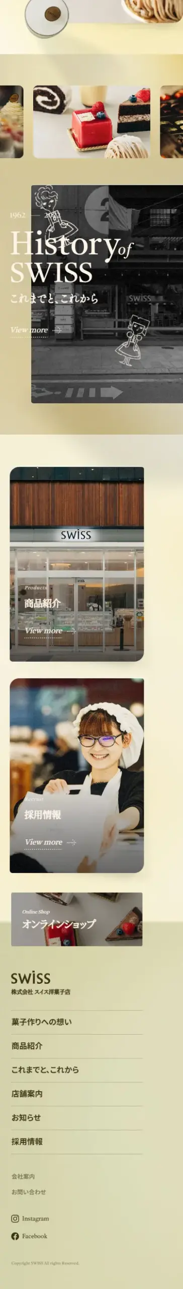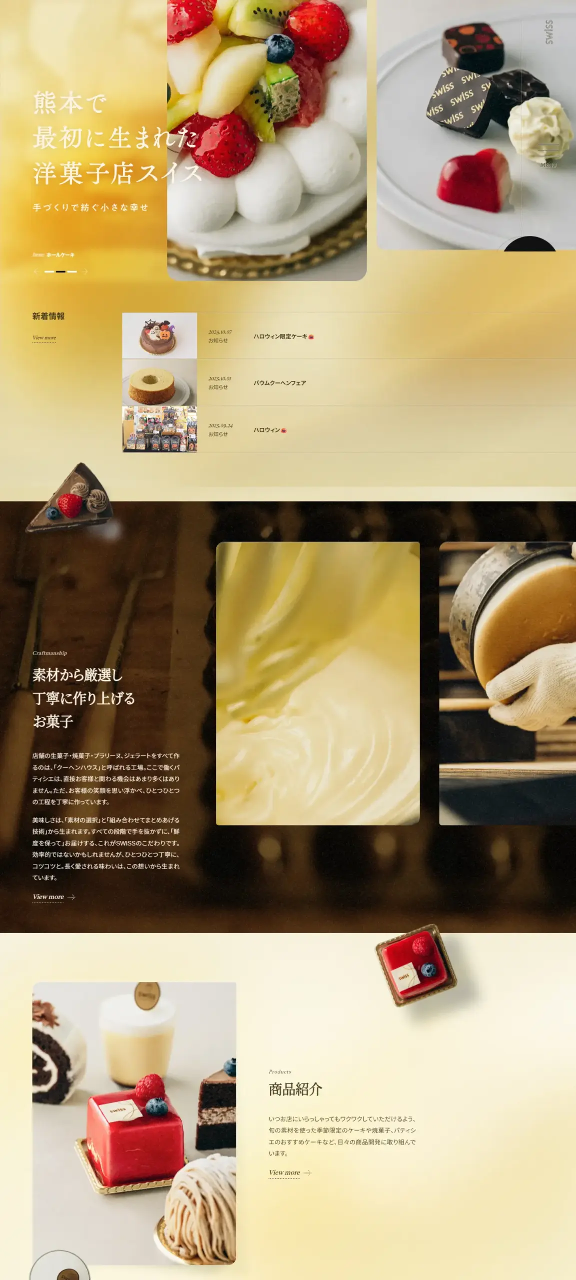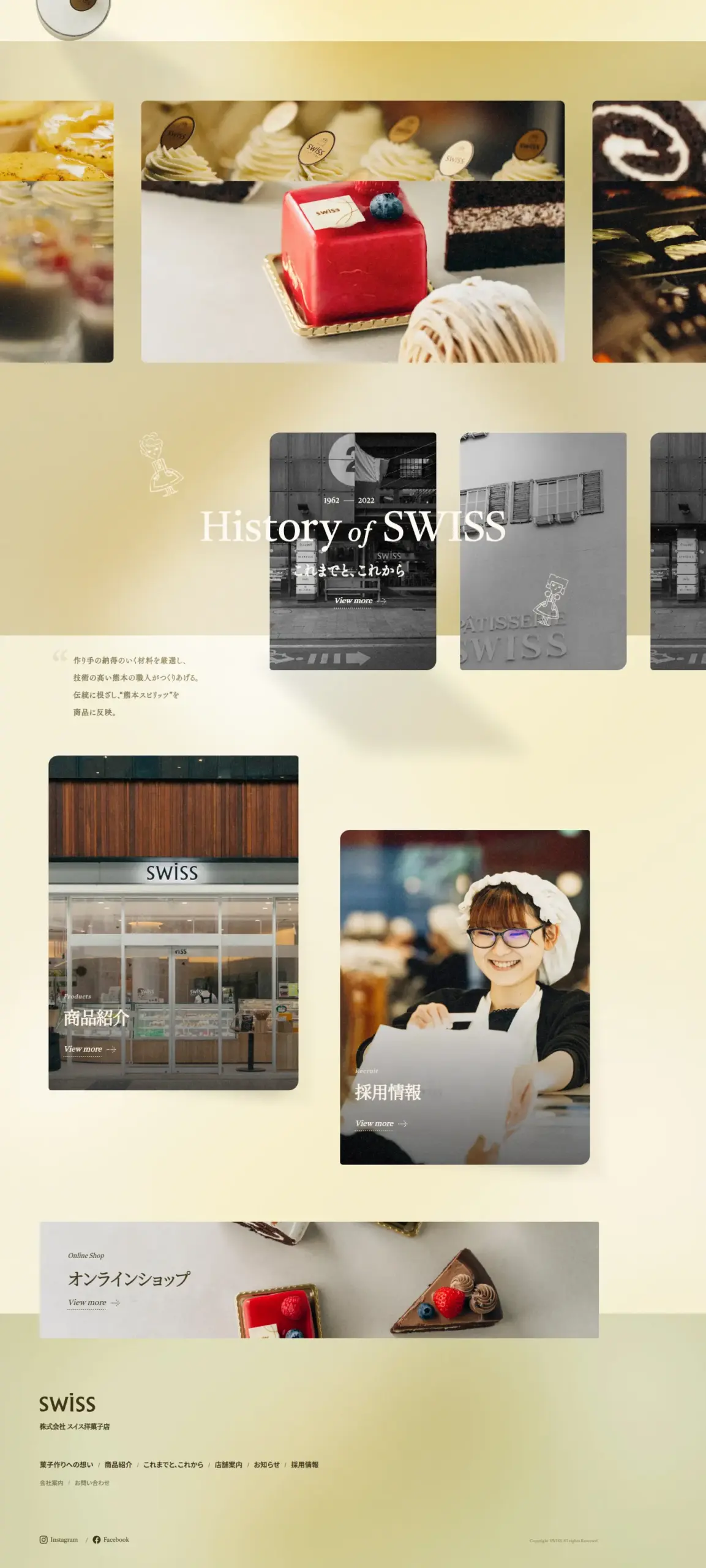 熊本で最初の洋菓子店SWISS(スイス)は、自慢の生クリームを使ったケーキや素材を厳選した焼き菓子などのお菓子を販売しております。県内外のお客様に幅広く喜んで頂ける洋菓子を店目指しています。