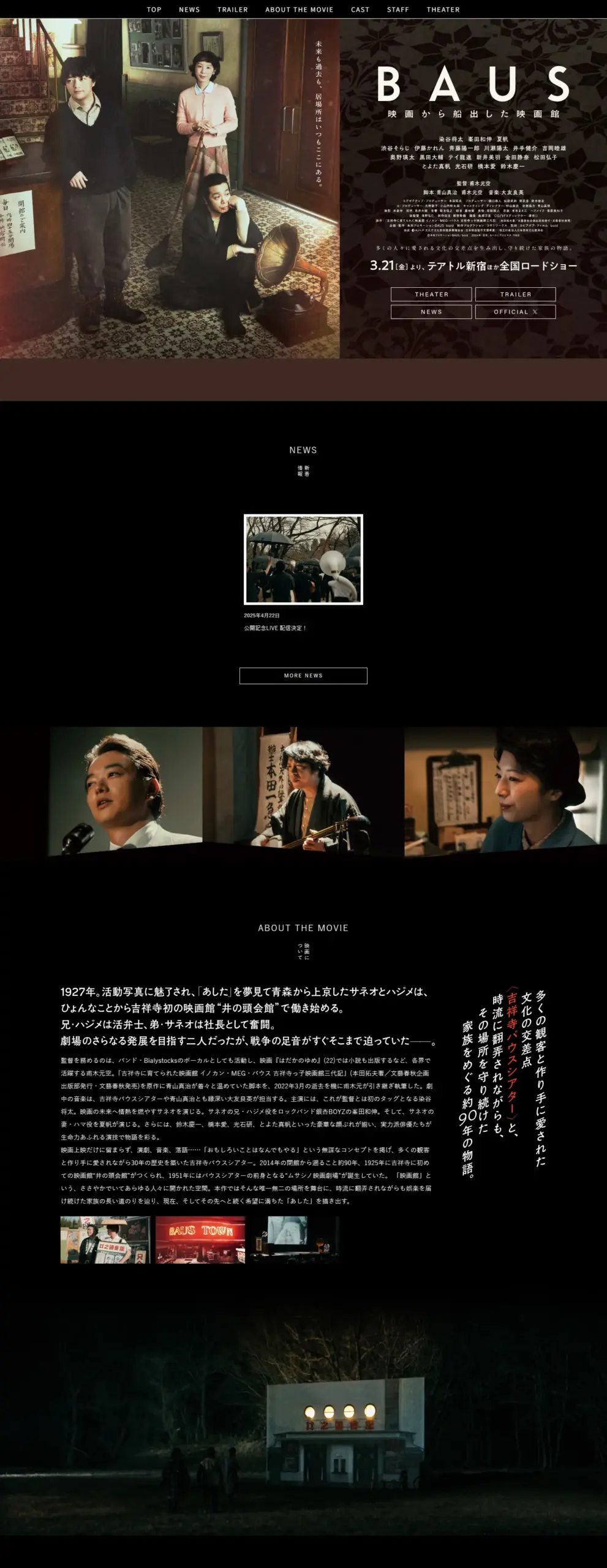 多くの観客と作り手に愛された文化の交差点<吉祥寺バウスシアター>と、時流に翻弄されながら、その場所を守り続けた家族をめぐる約90年の物語。