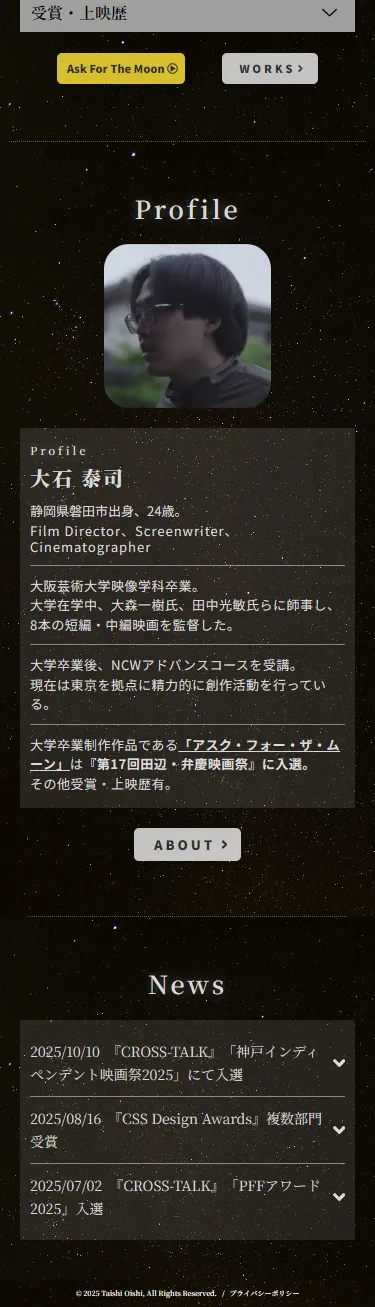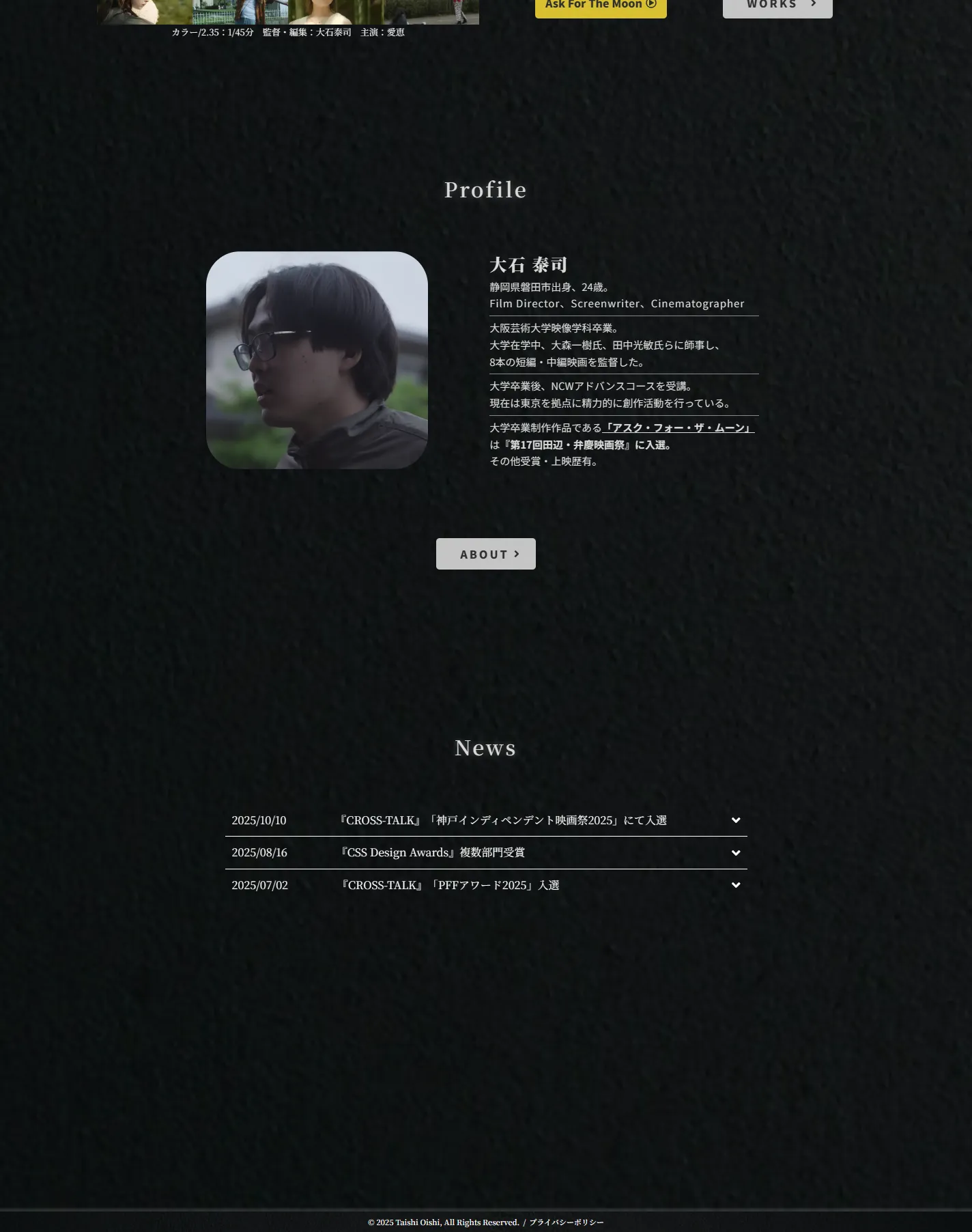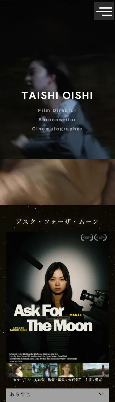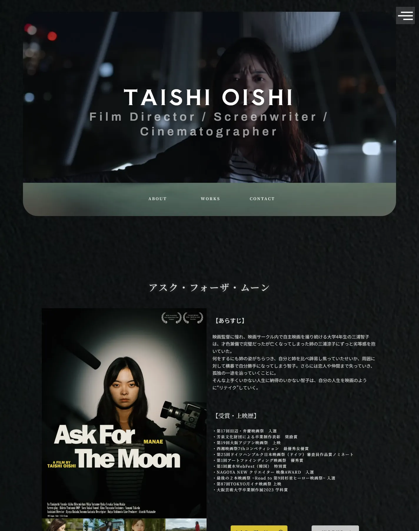 映画監督・脚本家・撮影監督として活動する大石泰司の公式サイト。『アスク・フォー・ザ・ムーン』をはじめ、作品情報を掲載。