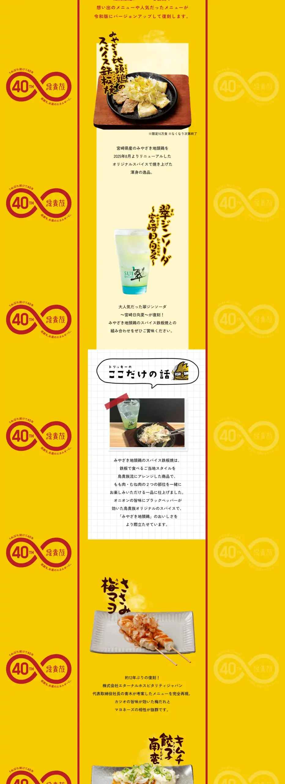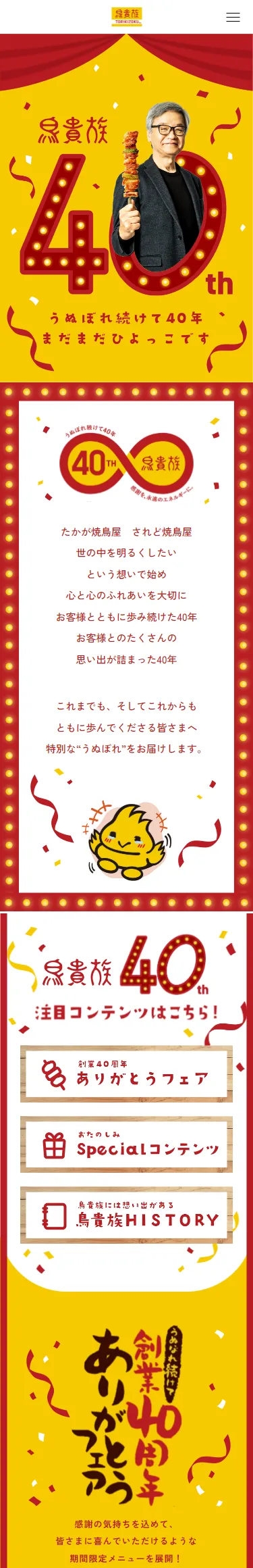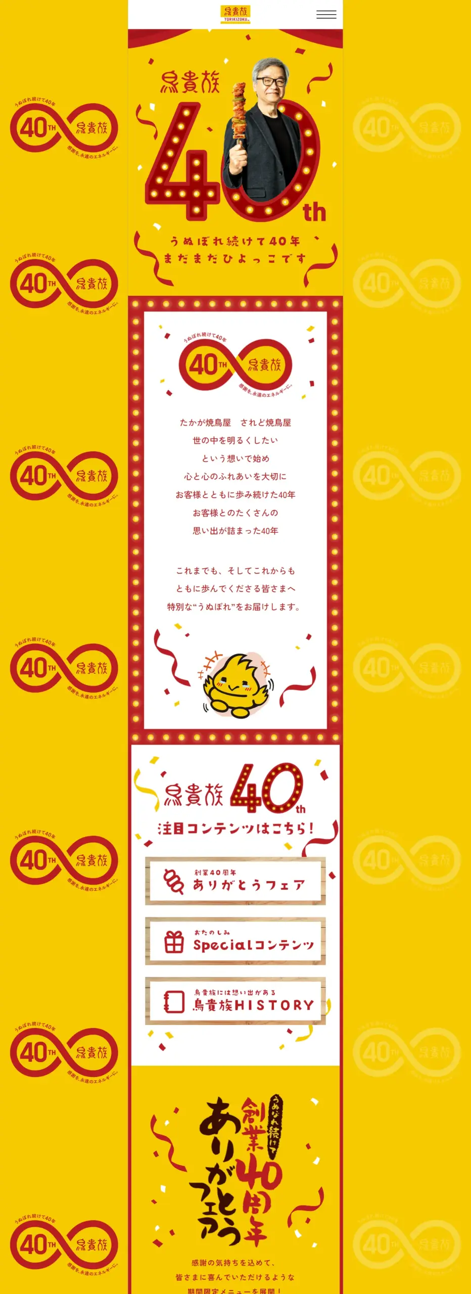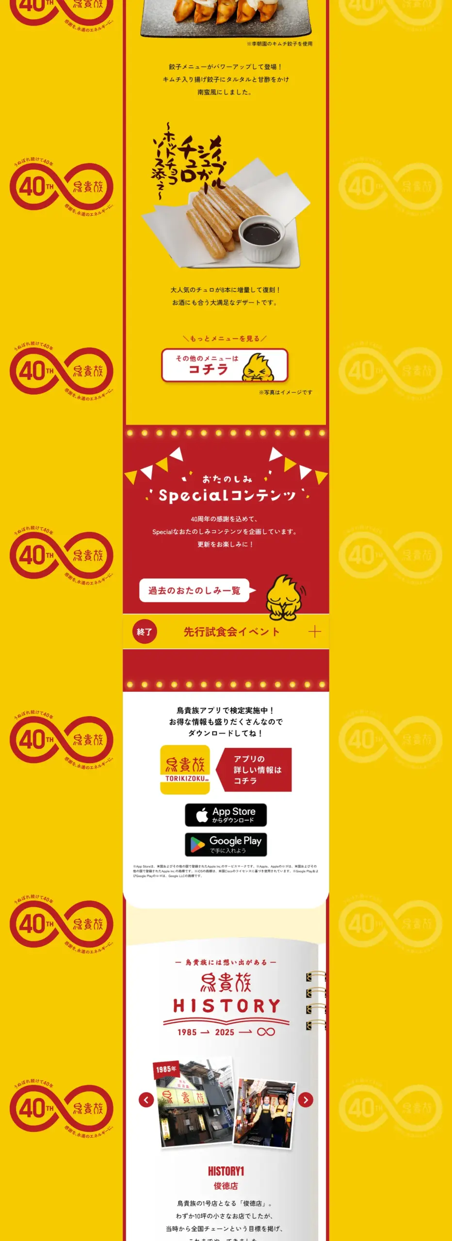 期間限定メニューが楽しめる創業40周年ありがとうフェアや鳥貴族HISTORYなどおたのしみコンテンツ公開中!