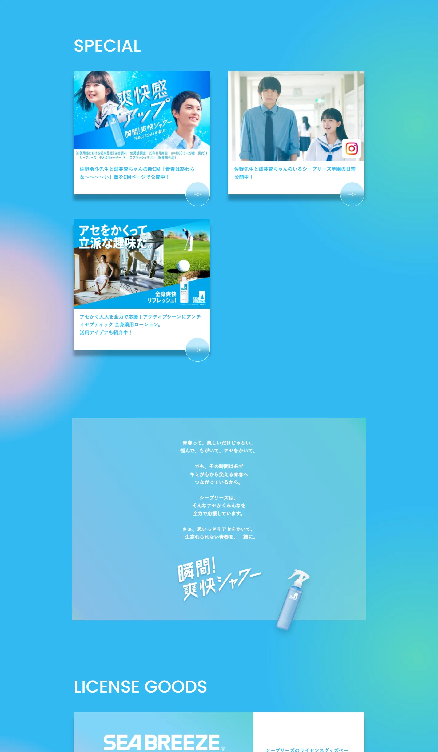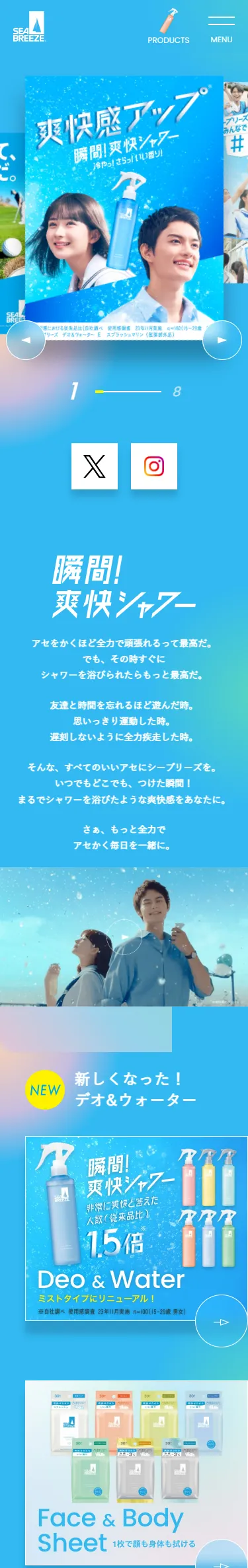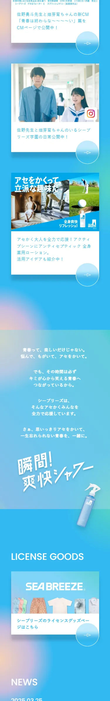 シャワーを浴びたかのような爽快感で、アセかくほど何かに夢中になる事を応援するボディケアブランド。シーブリーズの商品CMなど、最新情報をお届けします。
