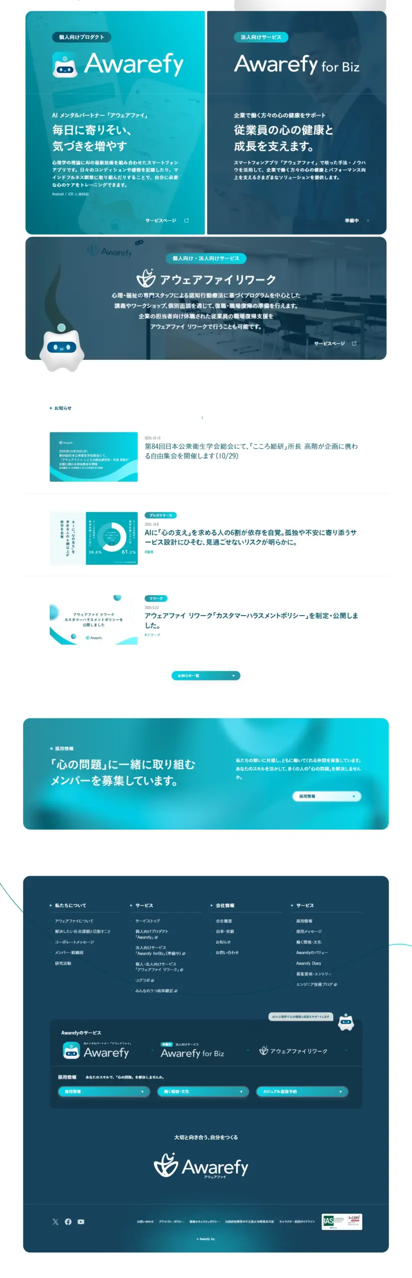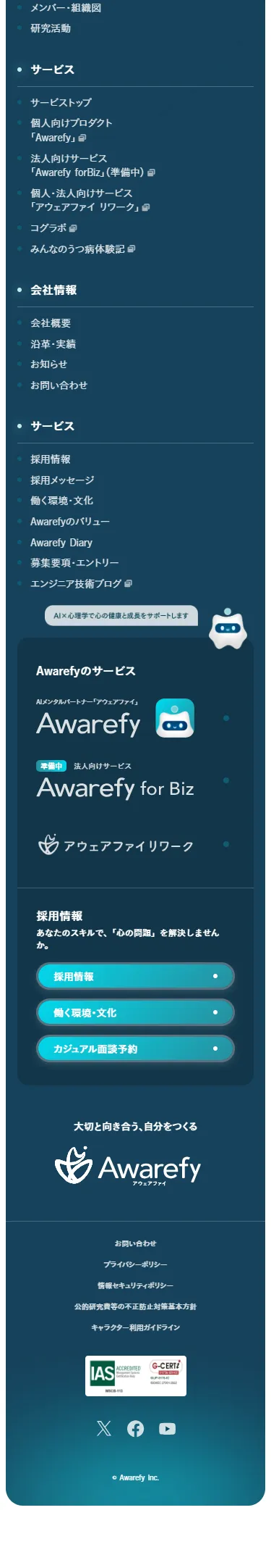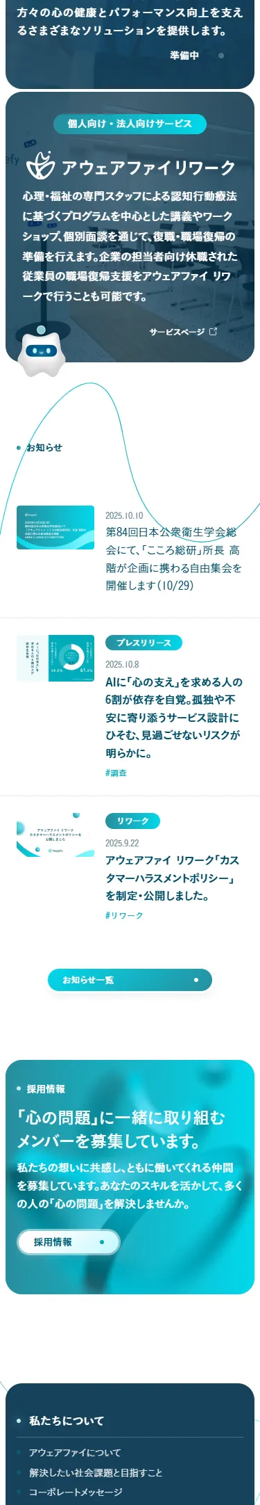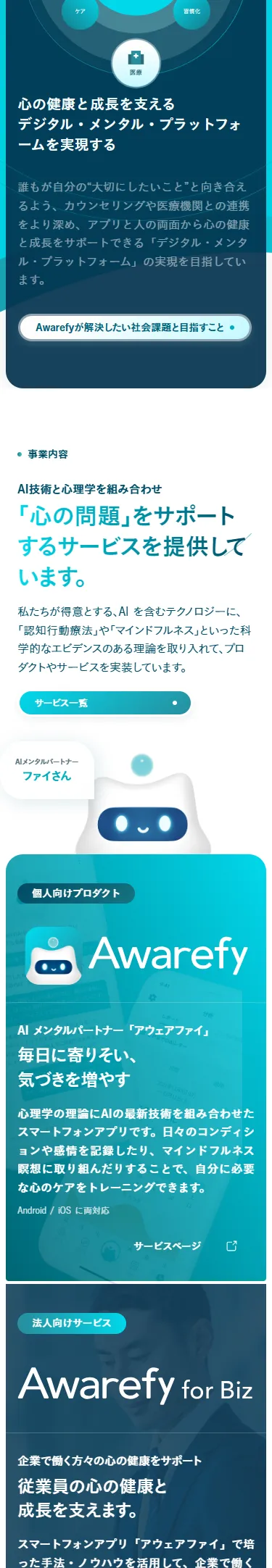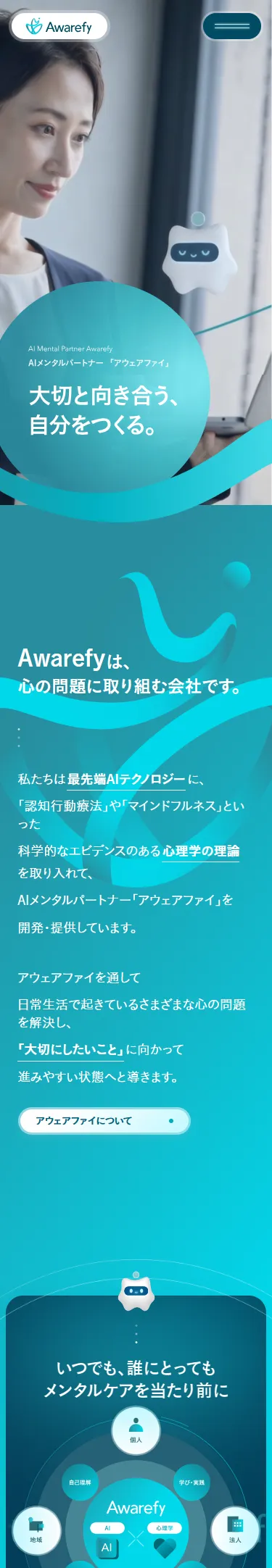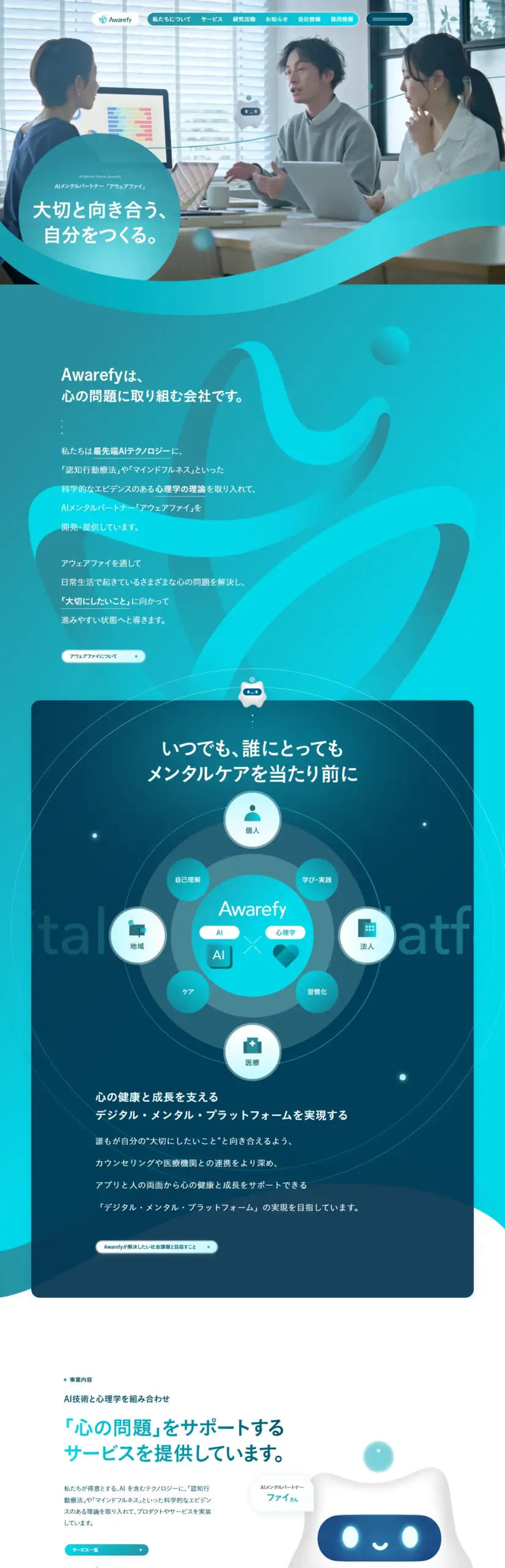 私たちは最先端のAIと心理学の理論を組み合わせ、大切なことへの気づきや行動変容を促すAIメンタルパートナー「アウェアファイ」を開発・提供しています。