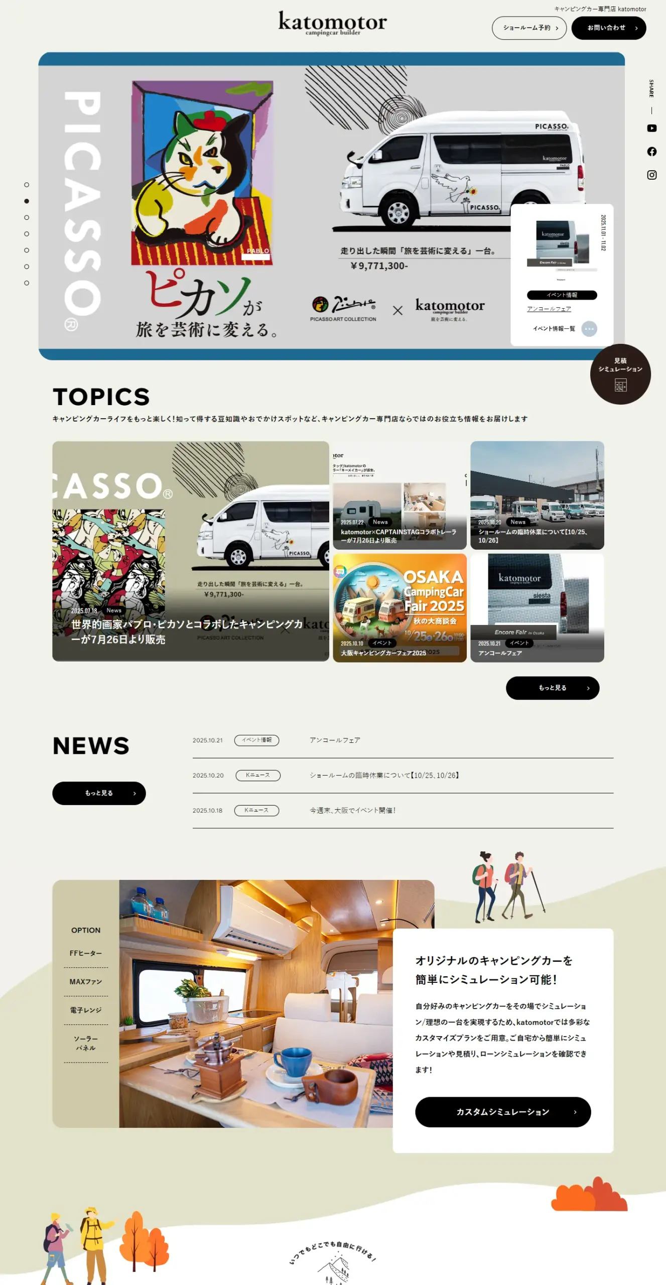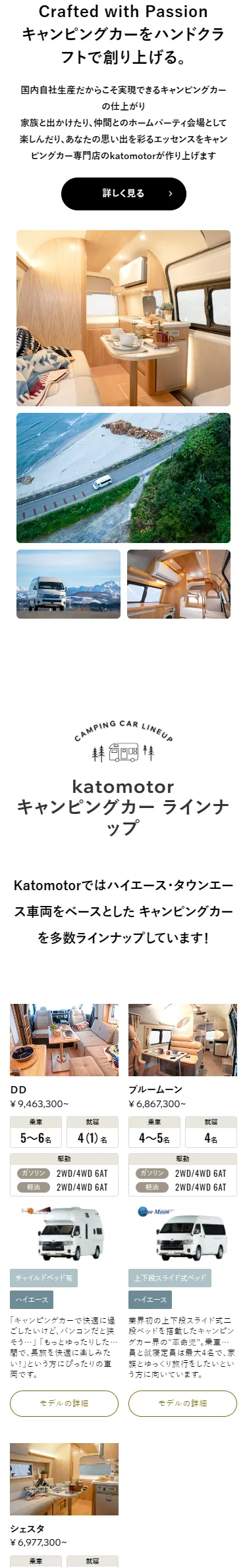 ハンドクラフトでこだわりのキャンピングカーを生み出しているキャンピングカー専門店katomotor。物づくりの郷燕三条の確かな技術で、日本製の長く大事に使える一台をご提供します。