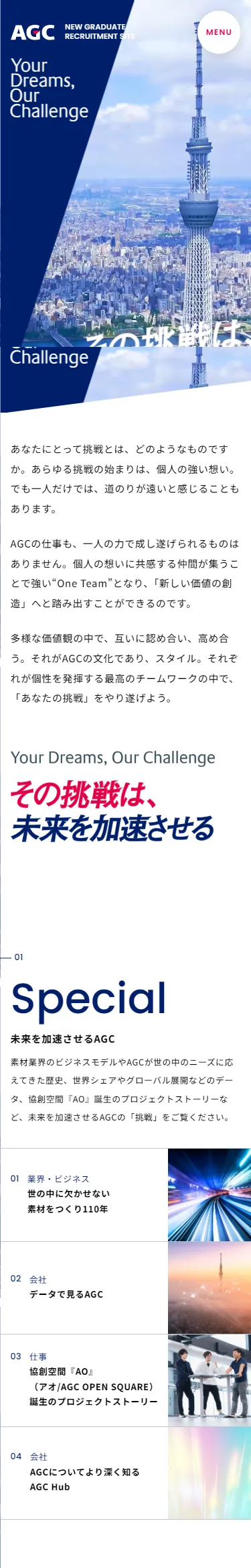 AGC株式会社の新卒採用サイトです。AGCの新卒採用情報をご覧いただけます。Your Dreams, Our Challenge その挑戦は、未来を加速させる。