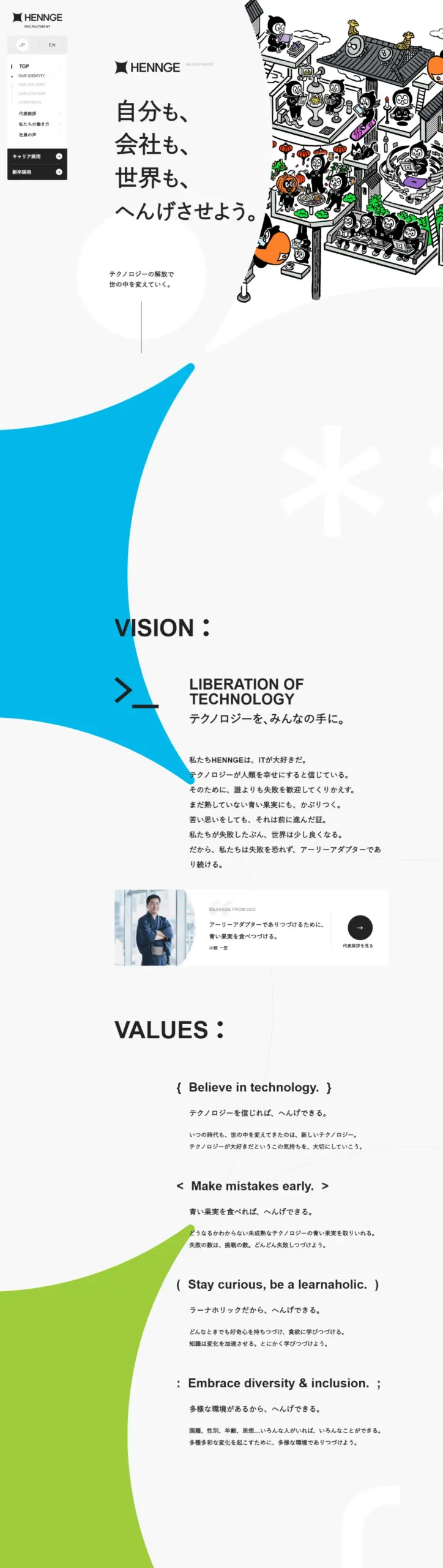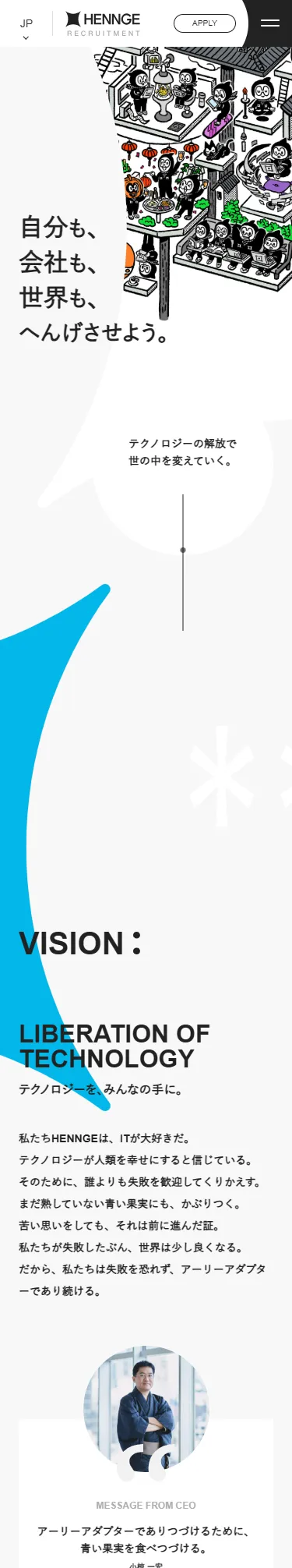 Recruitment site of HENNGE with its company mission as "LIBERATION OF TECHNOLOGY". / 「テクノロジーの解放」を理念に掲げるHENNGEの採用サイトです。