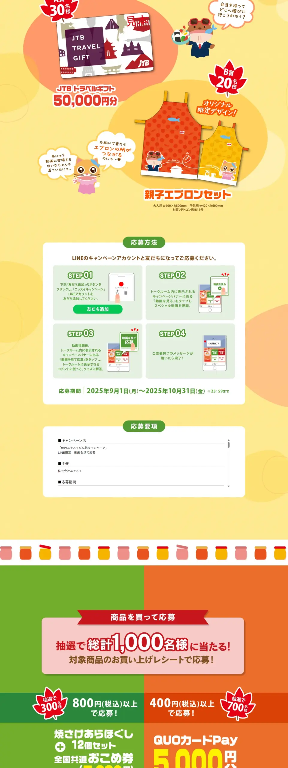 豪華景品が当たる!ニッスイ秋のびん詰キャンペーン実施中。対象のニッスイびん詰商品を購入で応募できるキャンペーンと、動画を見てクイズに答えるだけで応募できる2つのキャンペーンを同時開催中!