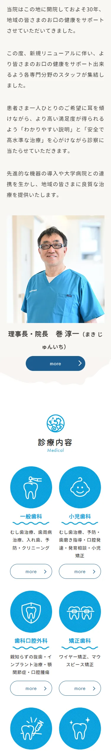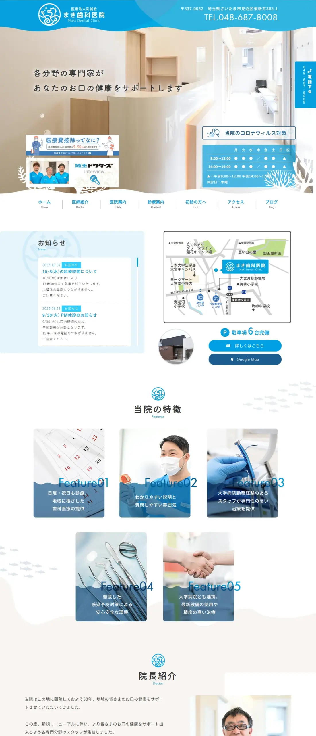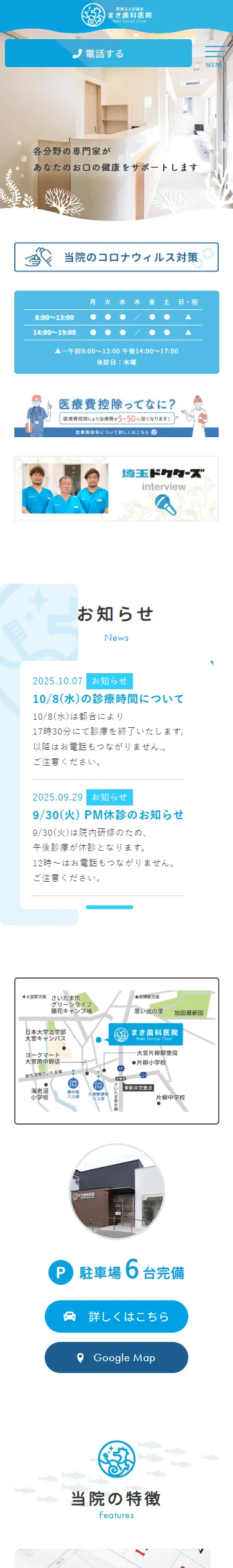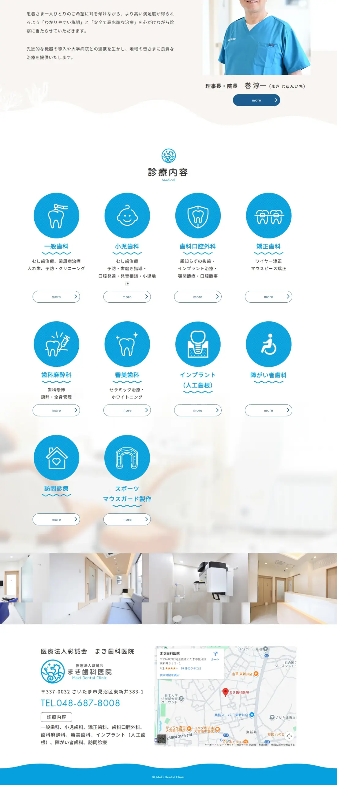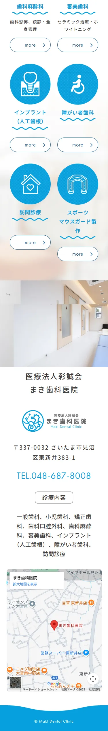 さいたま市見沼区東新井に開院して30年、【まき歯科医院】です。平日お仕事がお忙しい方を応援する土曜日曜祝日診療対応。各専門分野のスタッフが集結した、総合診療歯科医院です。地域の皆さまのお口の健康をサポートさせていただきます。