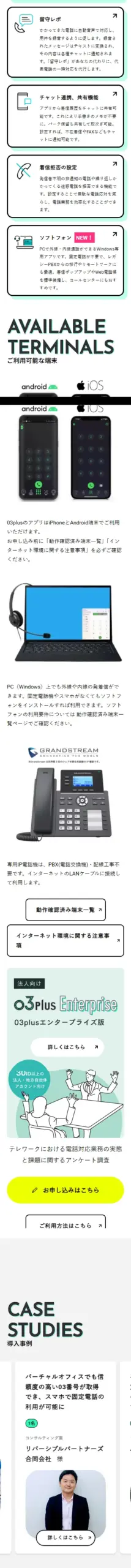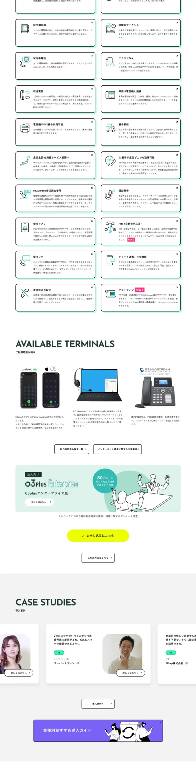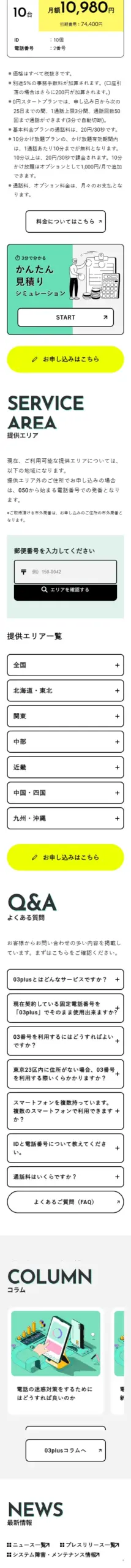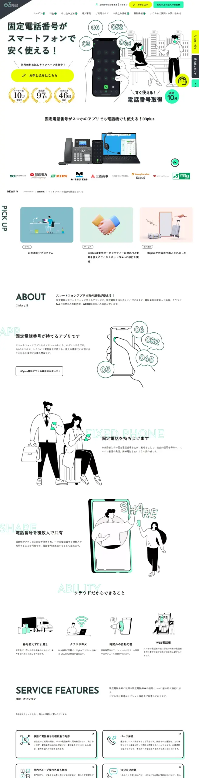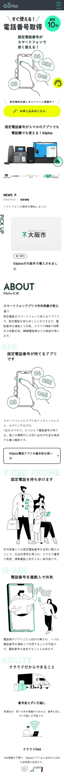 固定電話番号がスマホのアプリでも電話機でも使える!03plus(ゼロサンプラス)最短10分で市外局番の電話番号が取得でき、iPhoneやAndroidスマートフォンの電話アプリで発着信が可能。固定電話機も使用できます。0円スタートプランなら1ヶ月無料でご利用いただけます。12都道府県主要46の市外局番エリア(03番号、06番号など)に対応。