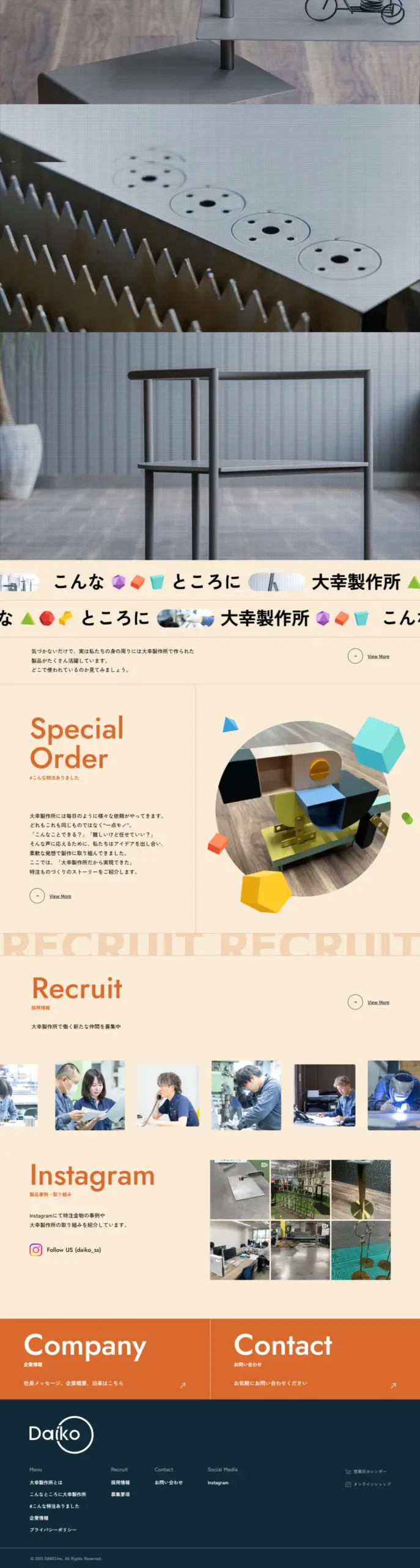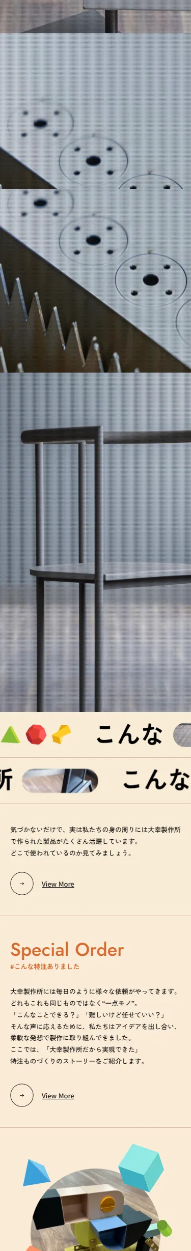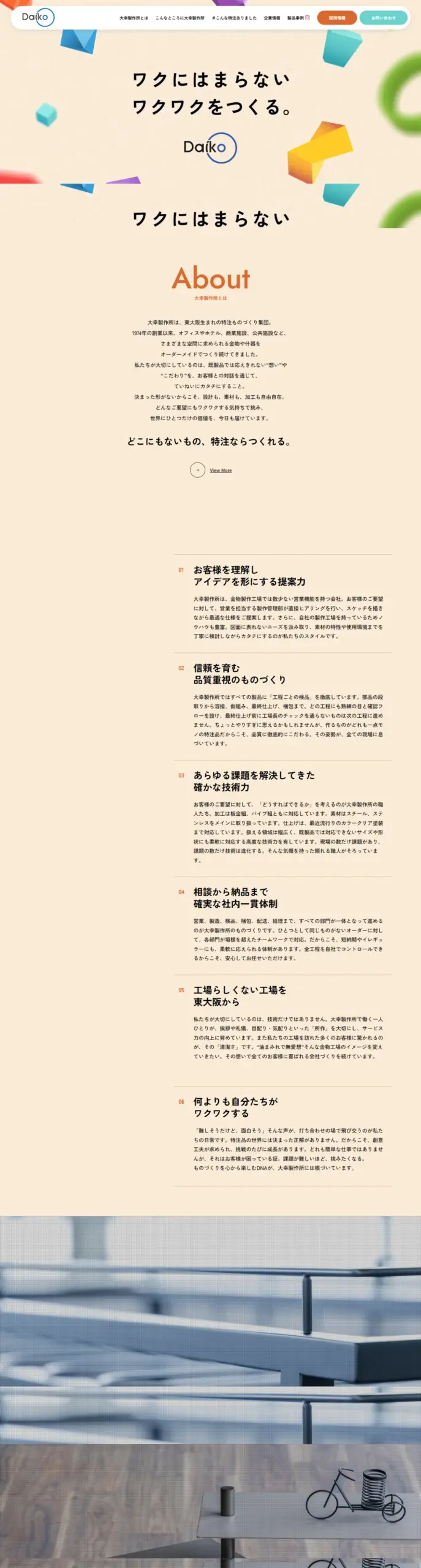 大幸製作所は東大阪生まれの特注ものづくり集団。1974年の創業以来、オフィスやホテル、商業施設などでオーダーメイドの金物や什器を提供し、お客様の想いやこだわりを丁寧にカタチにしています。