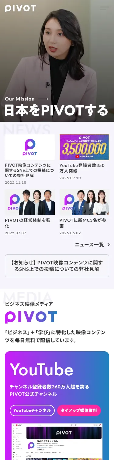 ビジネス映像メディアを運営するPIVOT株式会社のコーポレートサイトです。ビジネス、経済、投資、キャリア、教育などを軸に、新時代のマインドセット、スキルセットを高めるコンテンツを毎日配信しています。