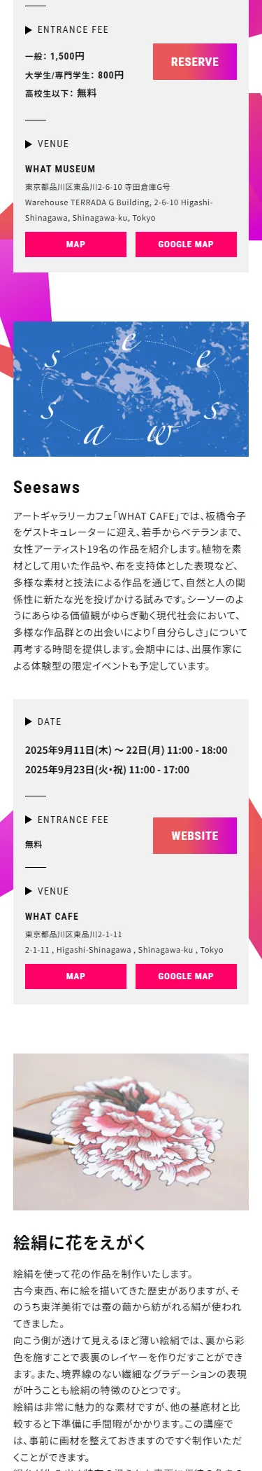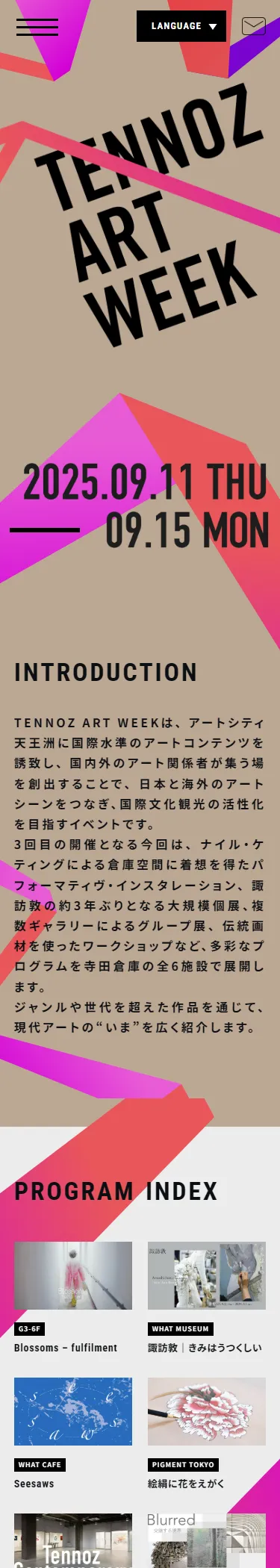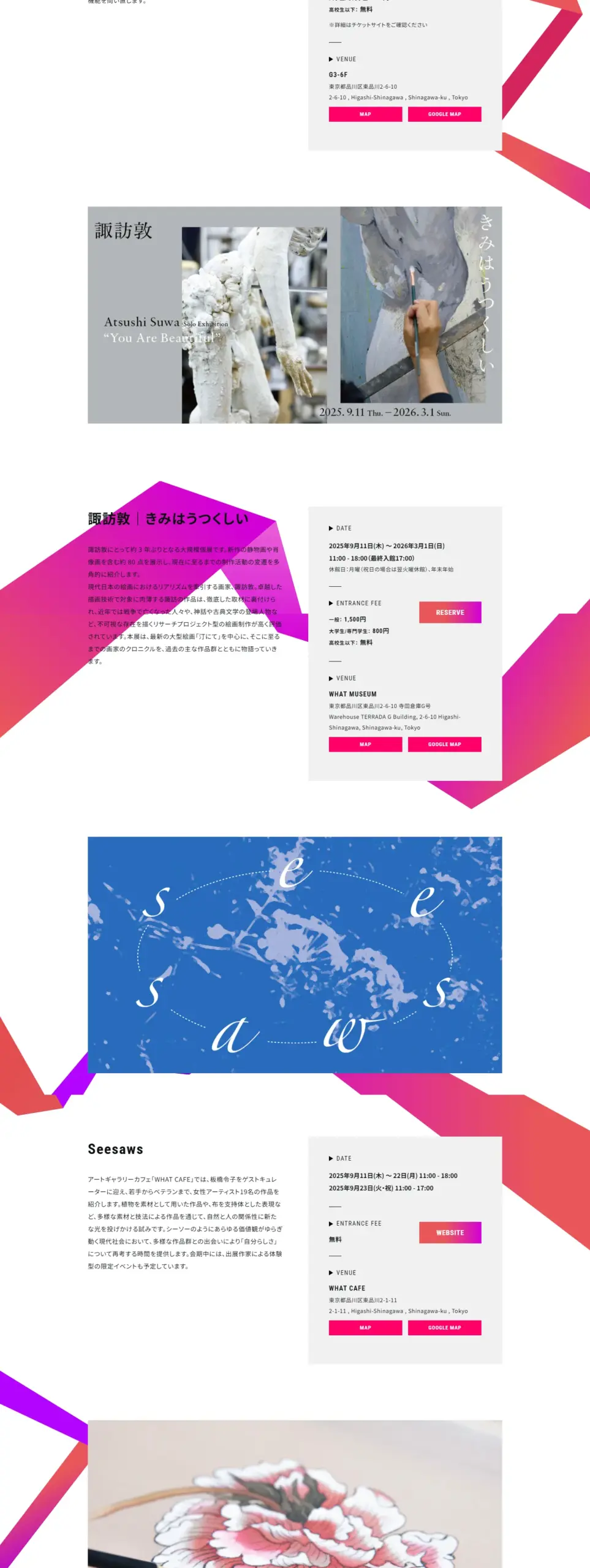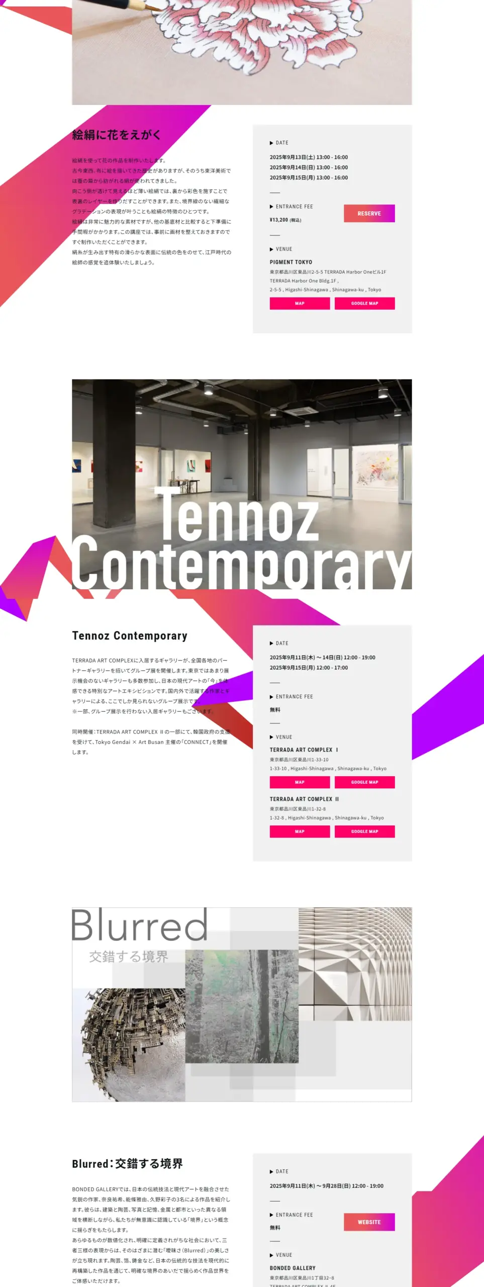 日本と海外のアートシーンを繋ぐ国際的なアートイベントです。インスタレーション、グループ展、ワークショップなどジャンルや世代を超えた作品を通じて、現代アートの“いま”を広く紹介します。