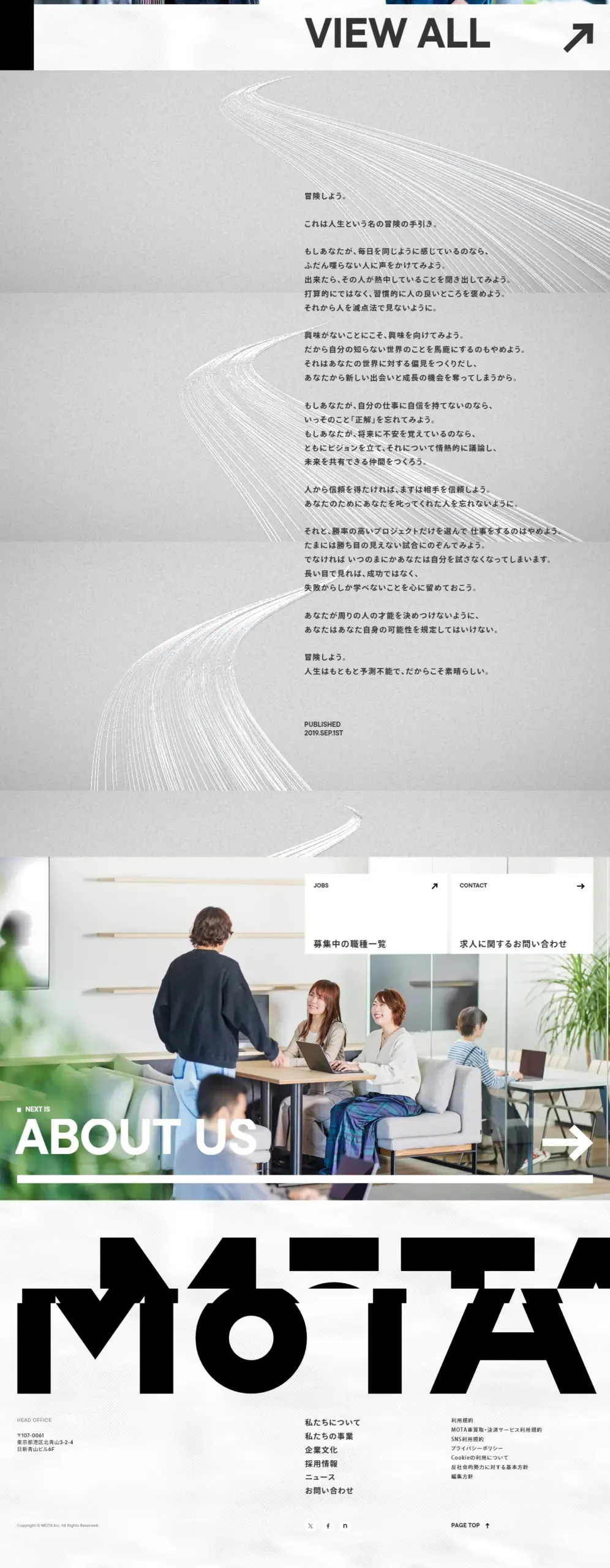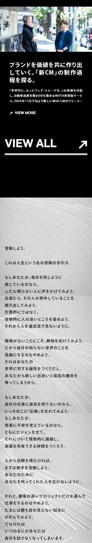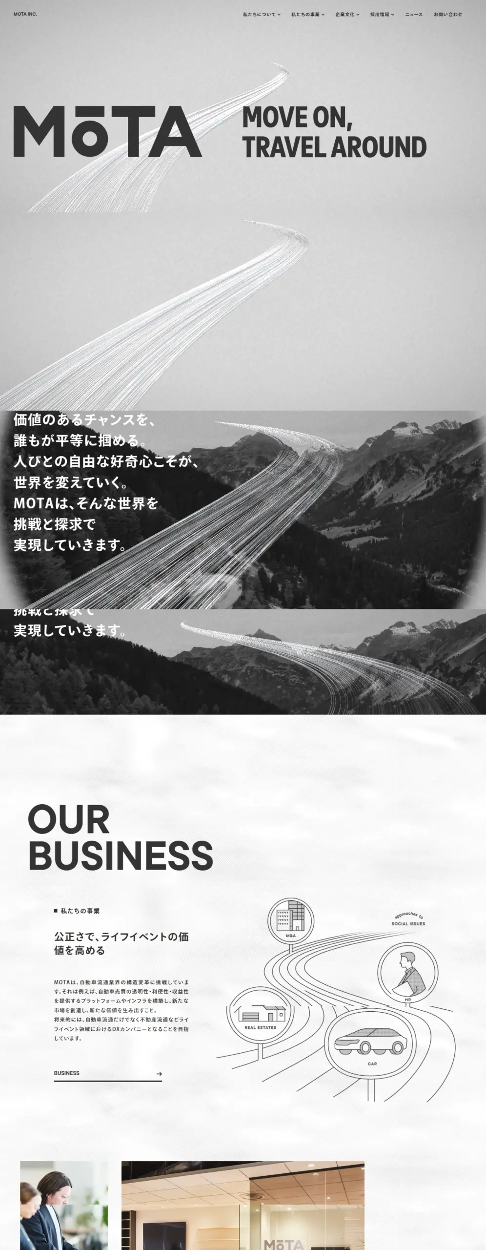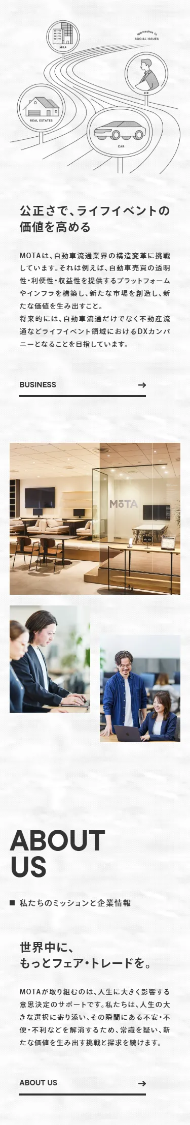 モビリティ事業を中心に、人生に大きく影響する意思決定をサポートし、ライフイベントの価値を高めるサービスを展開するMOTA(モータ)のコーポレートサイトです。価値のあるチャンスを、誰もが平等に掴める。人びとの自由な好奇心こそが世界を変えていく。私たちは、そんな世界を挑戦と探求で実現していきます。