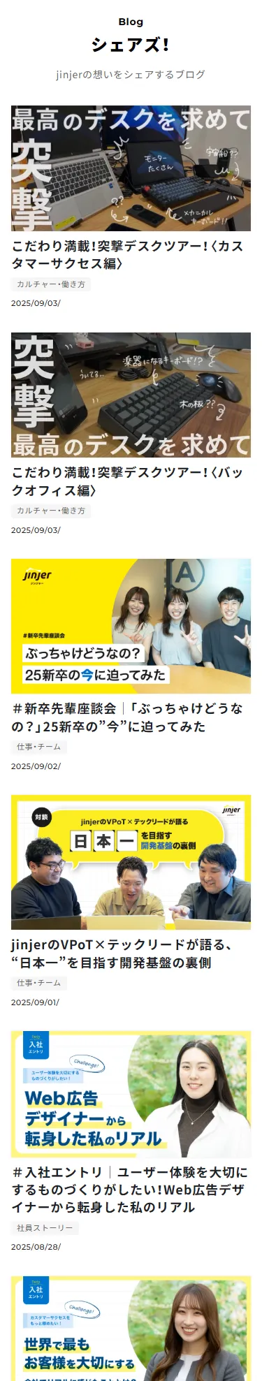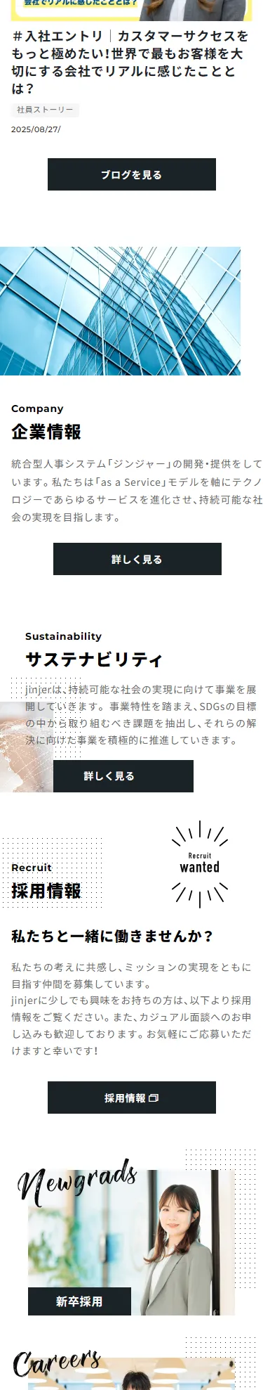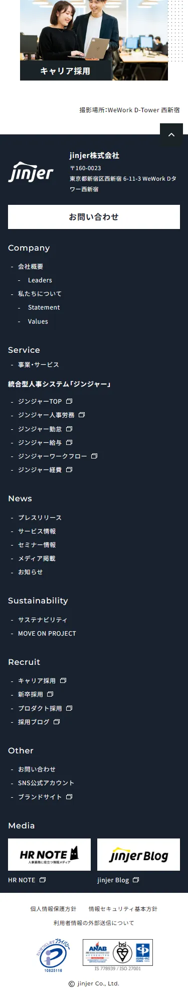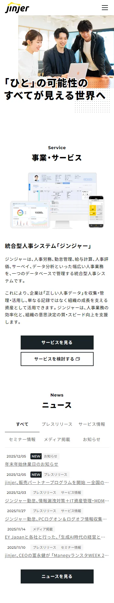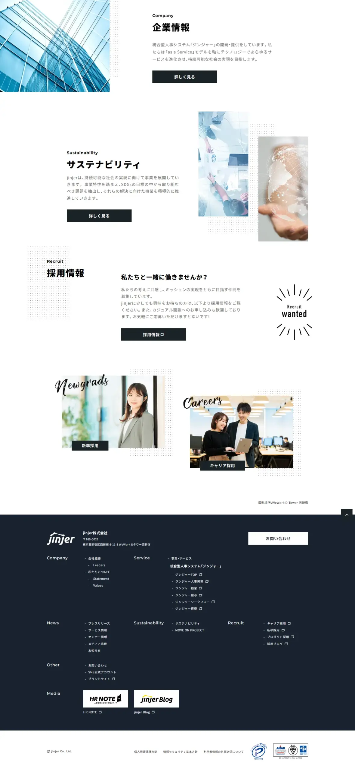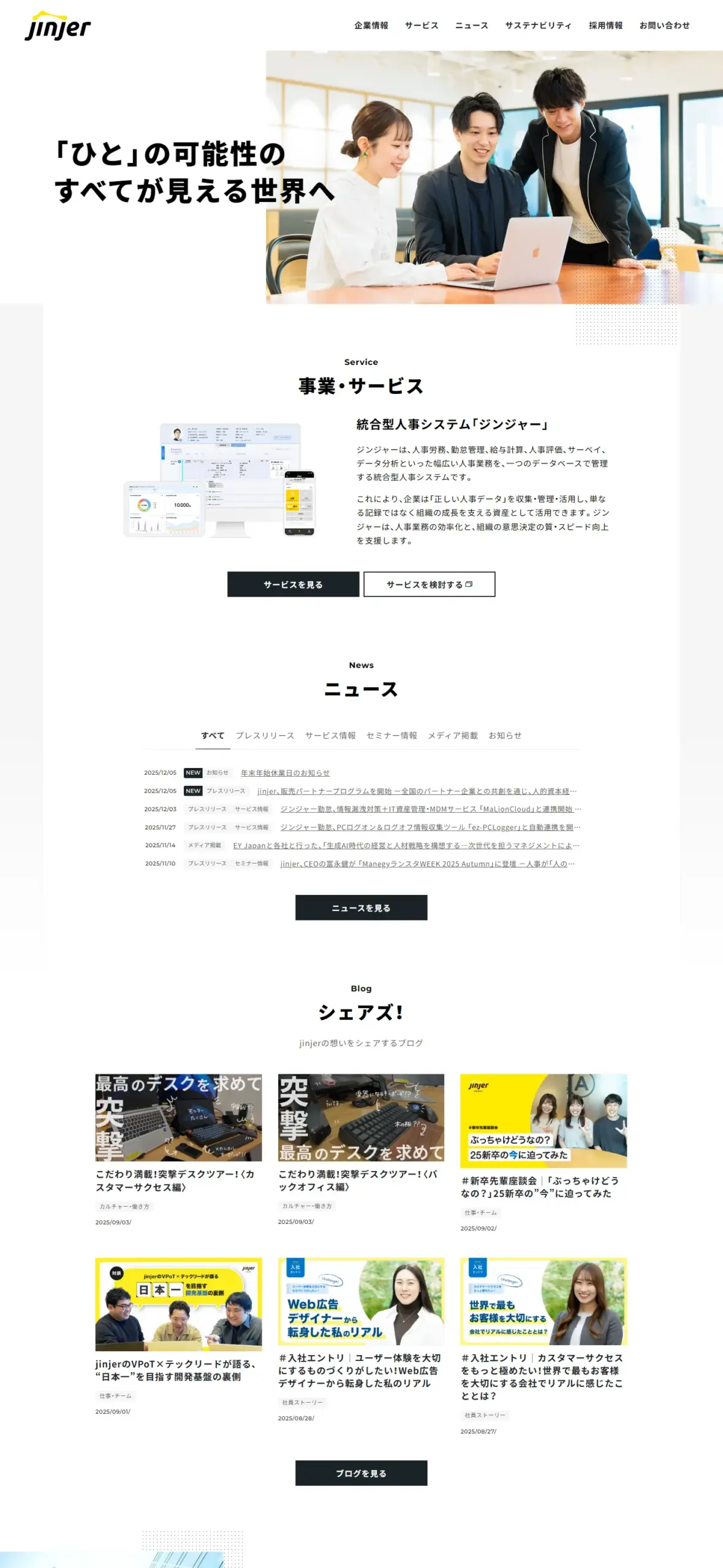 jinjer株式会社のホームページです。会社情報、ニュースリリース、採用情報、企業理念、サステナビリティなどをご紹介しております。jinjer株式会社は、クラウド型人事労務システムジンジャーや、人事に関する情報メディアHR NOTEなどを提供しております。