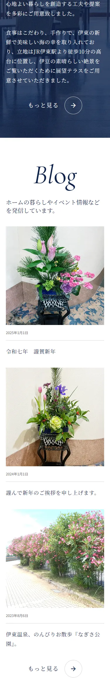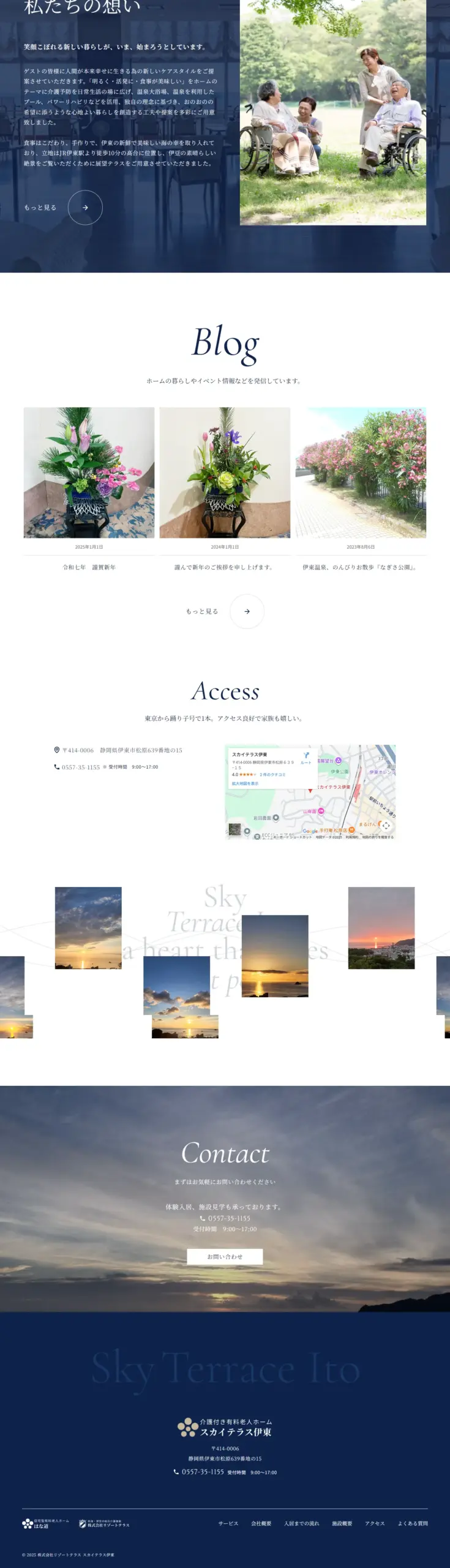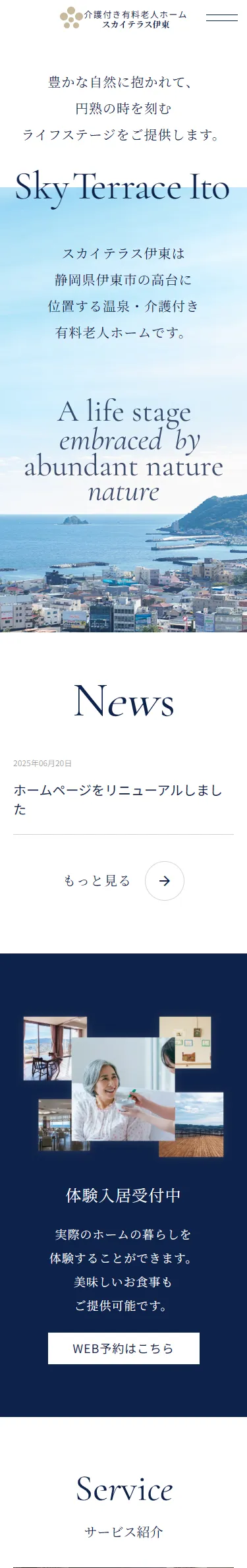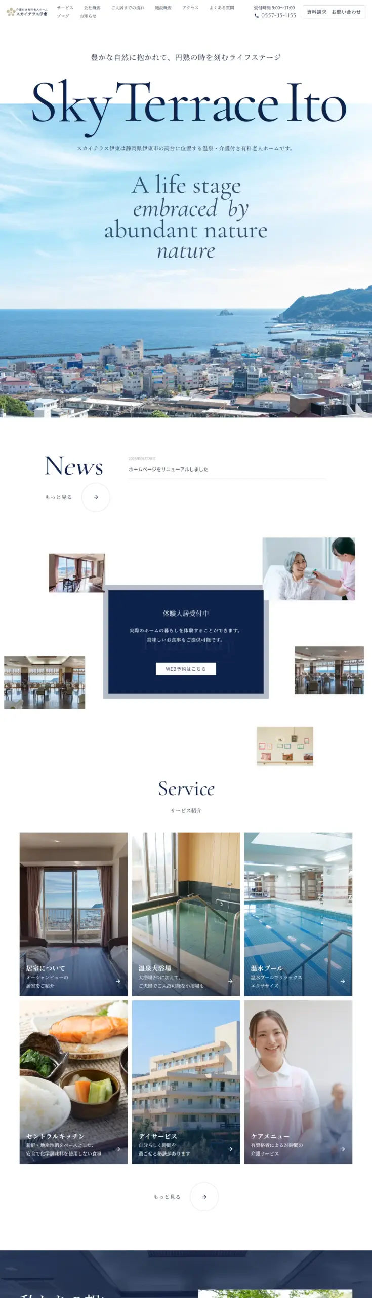 スカイテラス伊東は静岡県伊東市の高台に位置する温泉・介護付き有料老人ホームです。豊かな自然に抱かれて、円熟の時を刻むライフステージをご提供します。