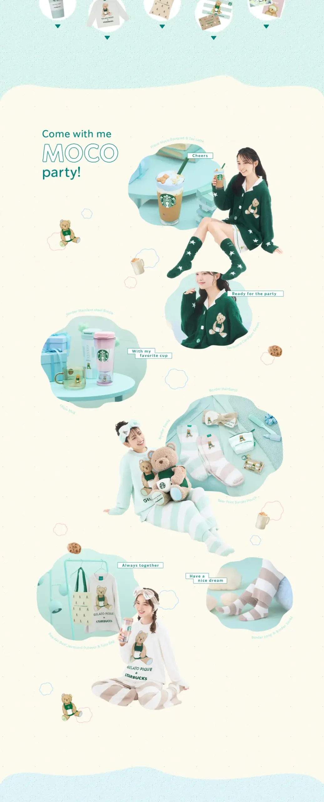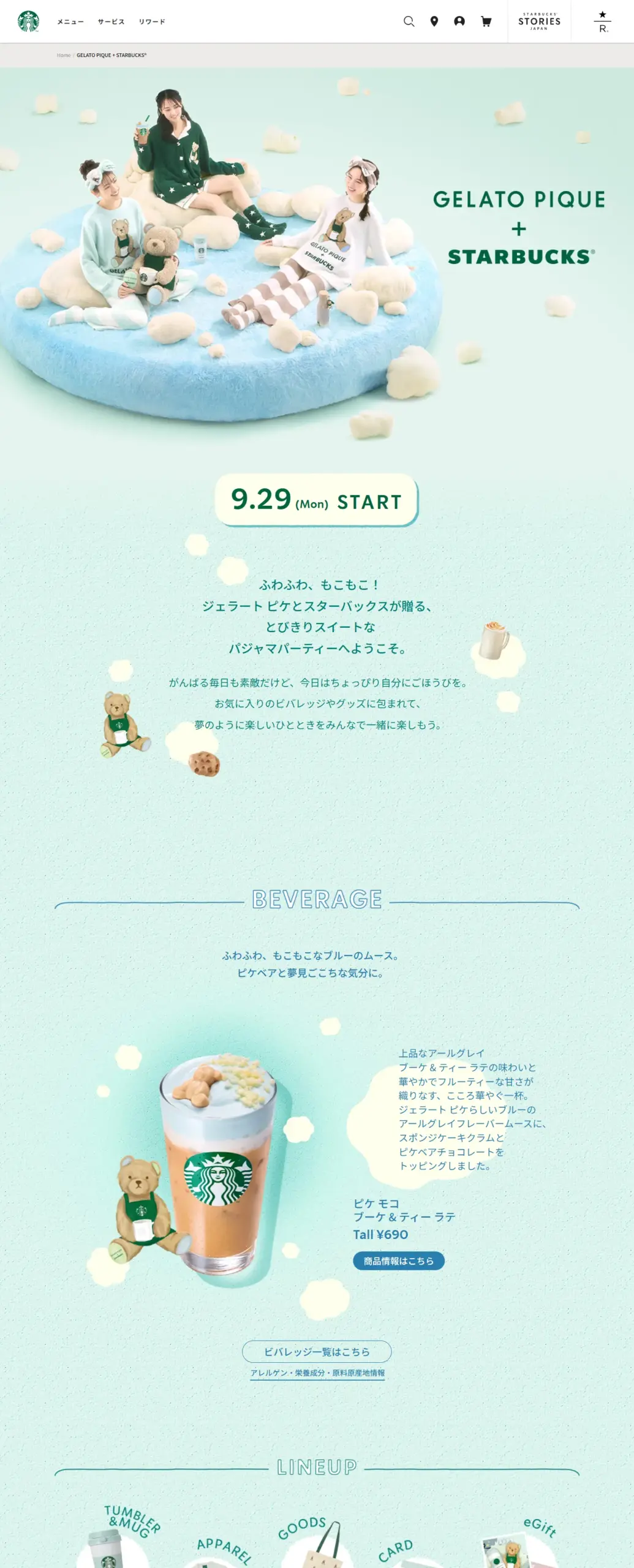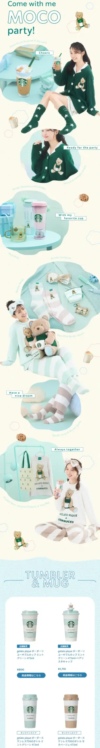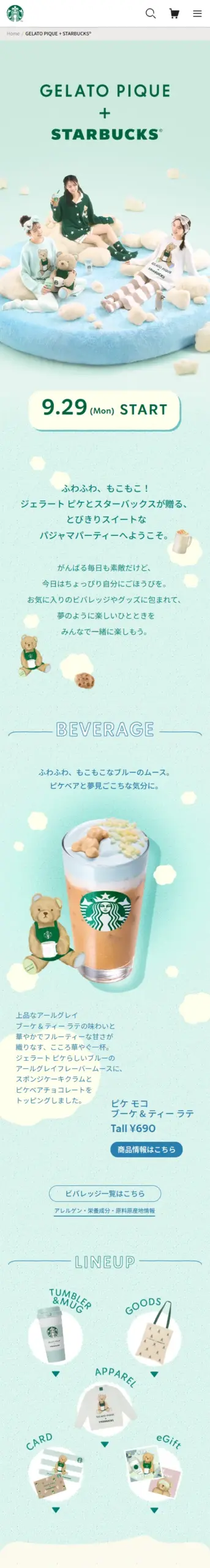 ふわふわ、もこもこ!ジェラート ピケとスターバックスが贈る、とびきりスイートなパジャマパーティーへようこそ。 がんばる毎日も素敵だけど、今日はちょっぴり自分にごほうびを。お気に入りのビバレッジやグッズに包まれて、夢のように楽しいひとときをみんなで一緒に楽しもう。