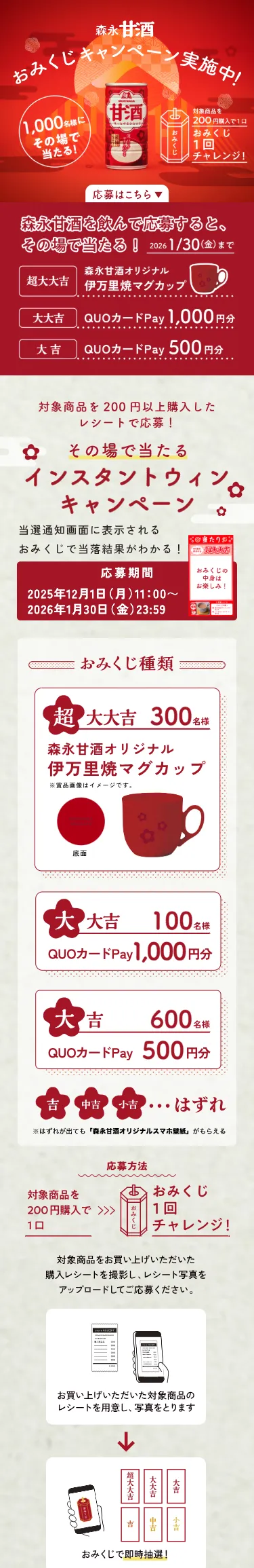 森永甘酒ではその場で当たるおみくじキャンペーン実施中!デジタルマネーやオリジナルグッズをプレゼント。この時期にぴったりなキャンペーンを、ぜひお楽しみください。