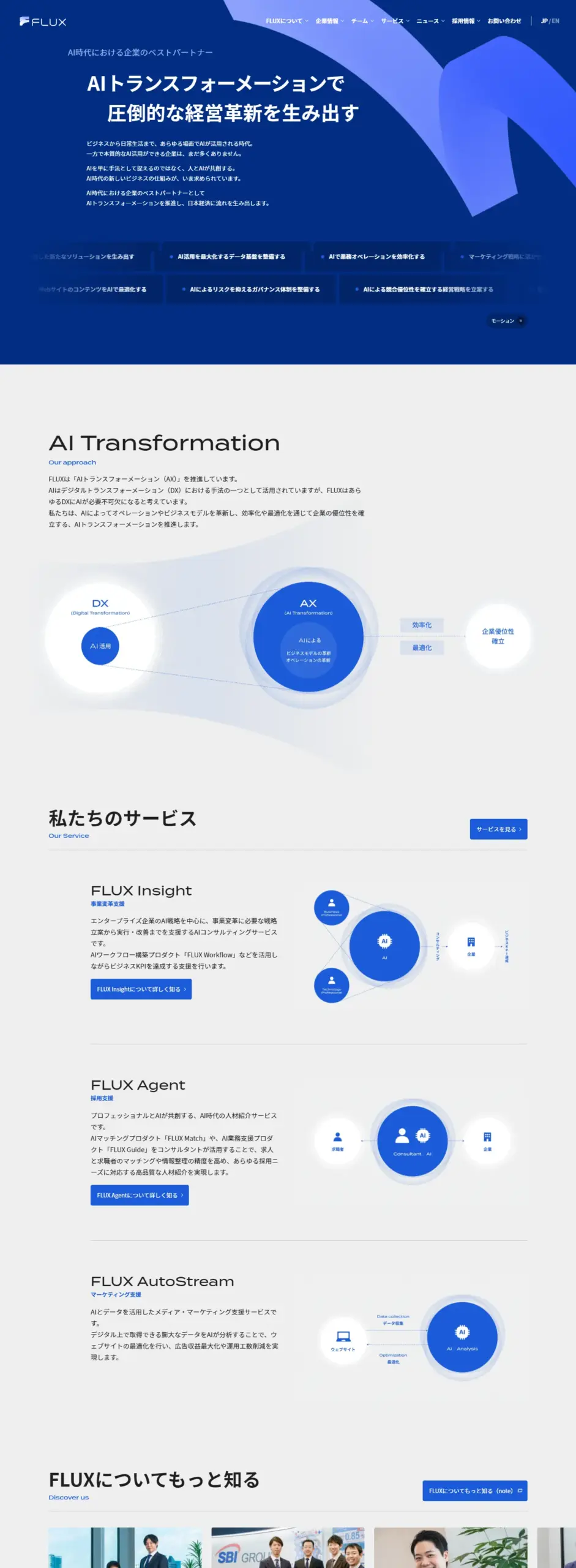 株式会社FLUX(フラックス)は「日本経済に流れを」をミッションに掲げ、AI時代における企業の戦略パートナーとして、AIトランスフォーメーションを推進するスタートアップです。