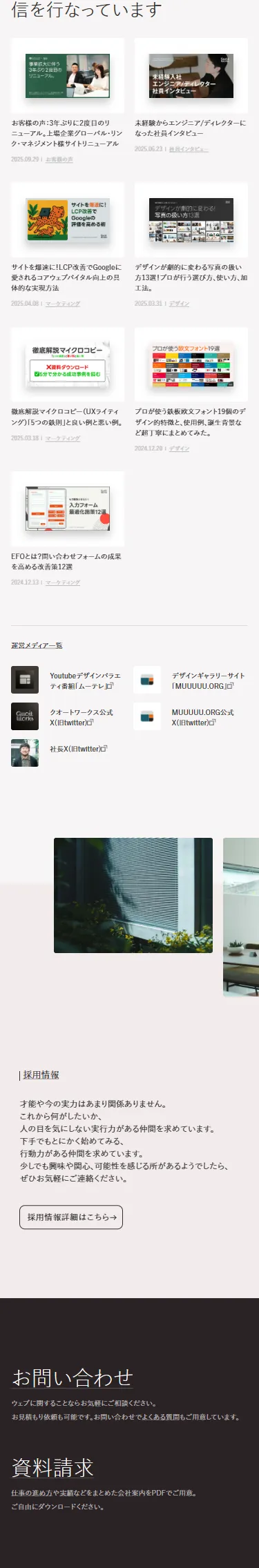 デザイン提案に定評あるWeb制作会社クオートワークス。私たちは、「お客さまの課題を王道に、正面から解決すること」「クリエイターとしてのプライドを持ったモノづくり」の二軸を両立し、「有用であり、美しい」モノづくりを目指す、デザインプロダクションです。