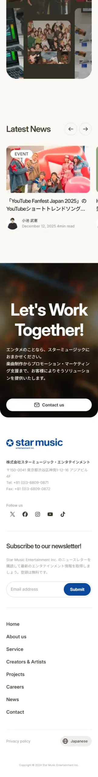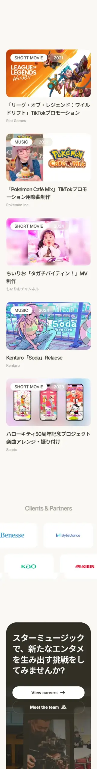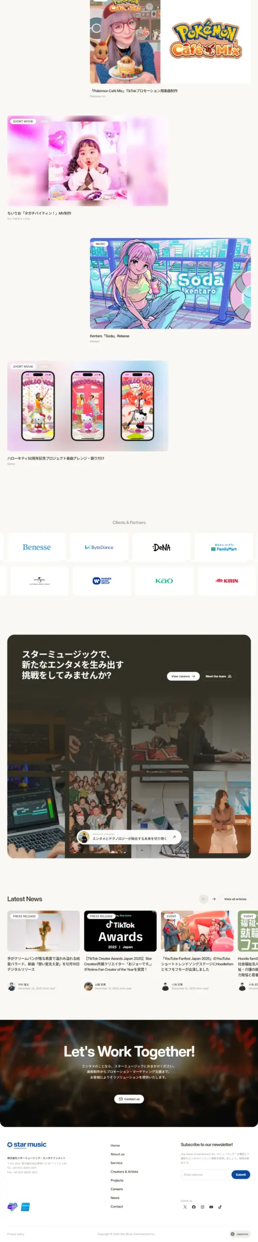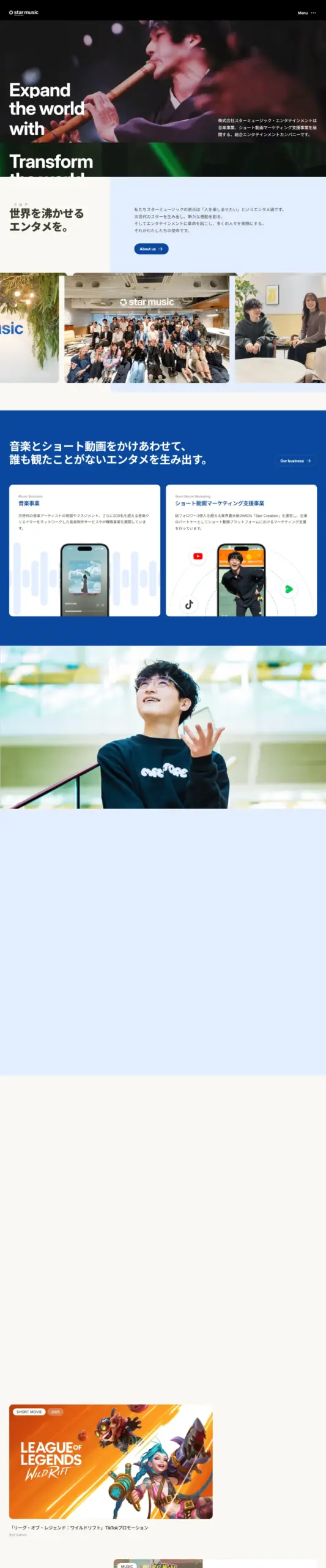 スターミュージックは、「世界を沸かせるエンタメを。」をビジョンに掲げ、 音楽事業やショート動画マーケティング事業を展開する総合エンタテインメント企業です。