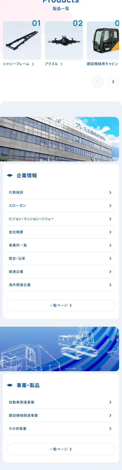 プレス工業公式サイト。プレス工業は主にトラックのフレーム・アクスルや建設機械用キャビンを生産している会社です。