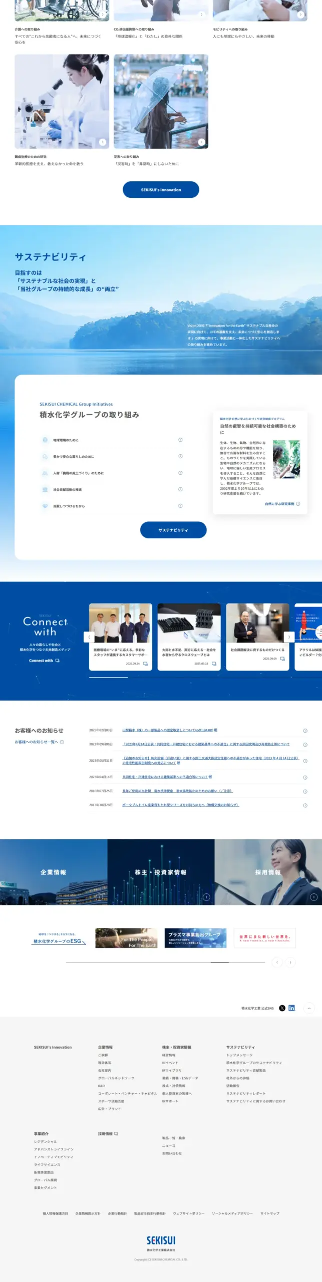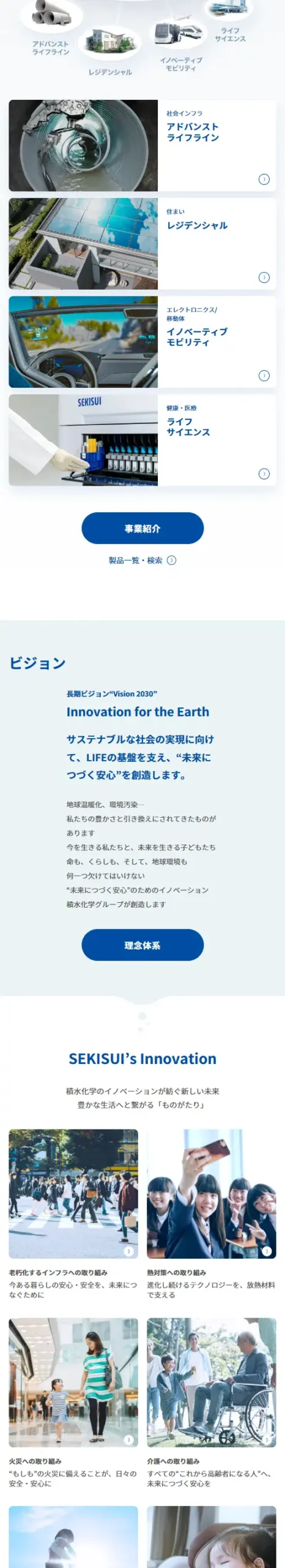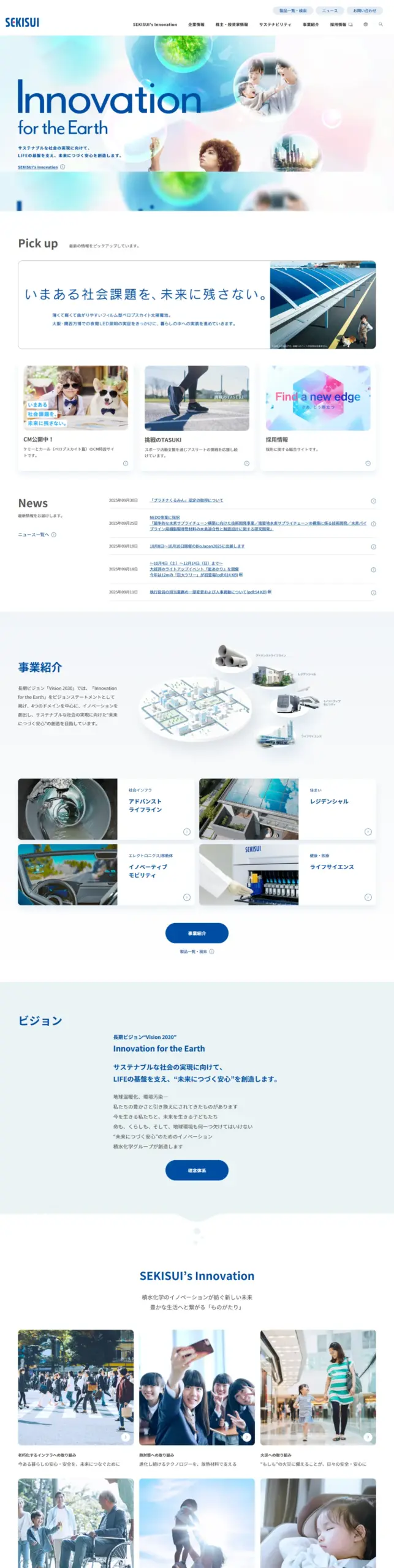 積水化学工業株式会社の企業情報、サステナビリティ、株主・投資家情報、製品情報、採用情報などを網羅したウェブサイト。積水化学グループはサステナブルな社会の実現に向けて、LIFE の基盤を支え、“未来につづく安心”を創造し社会に貢献いたします。