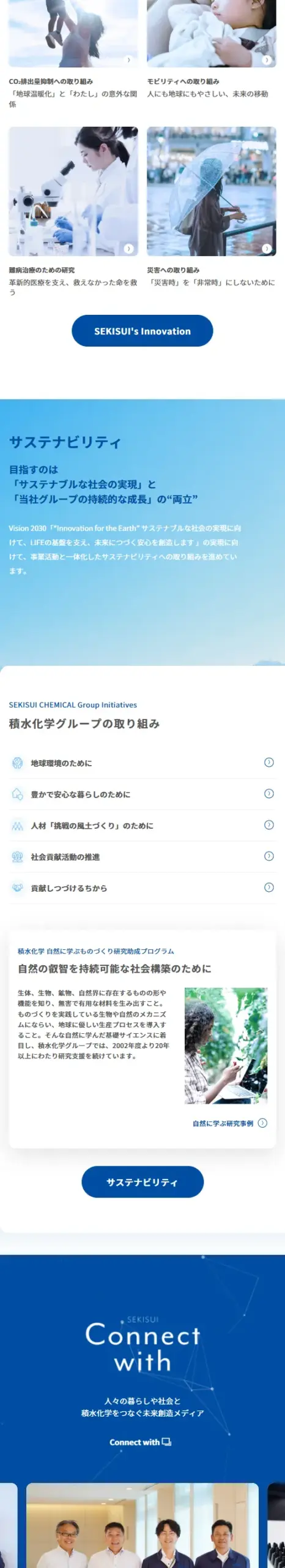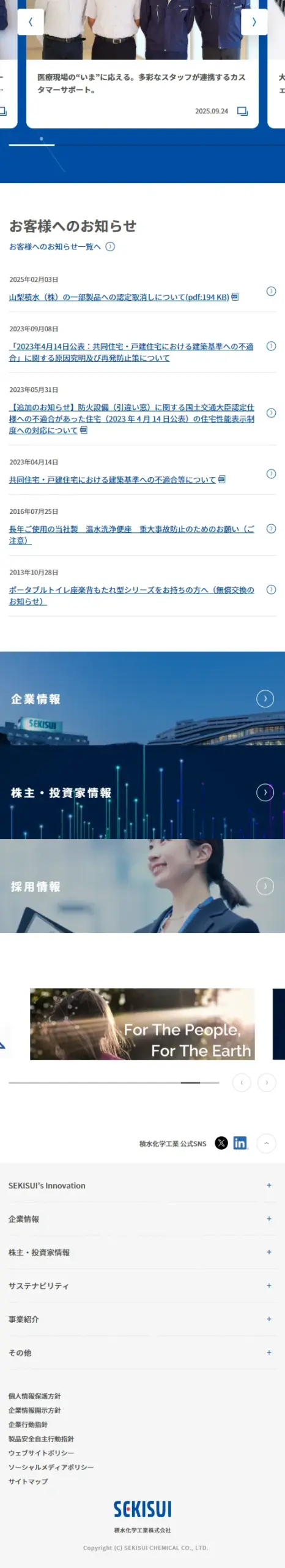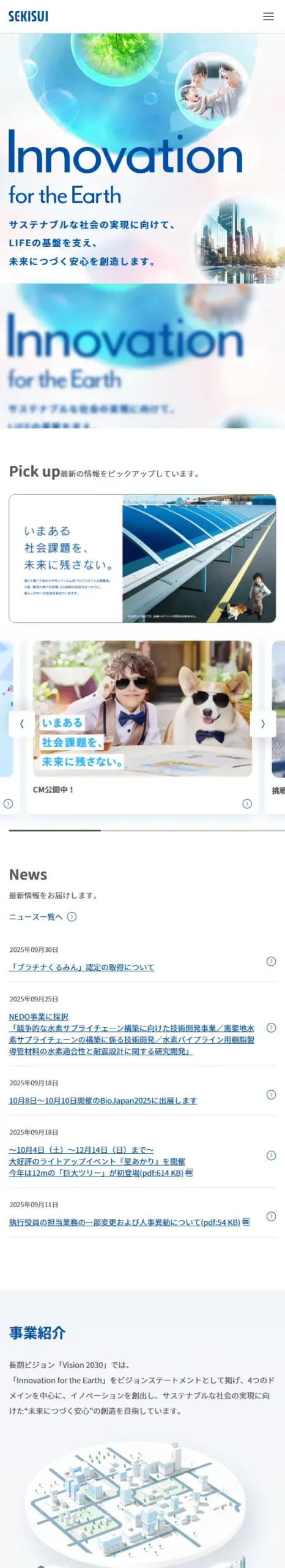 積水化学工業株式会社の企業情報、サステナビリティ、株主・投資家情報、製品情報、採用情報などを網羅したウェブサイト。積水化学グループはサステナブルな社会の実現に向けて、LIFE の基盤を支え、“未来につづく安心”を創造し社会に貢献いたします。